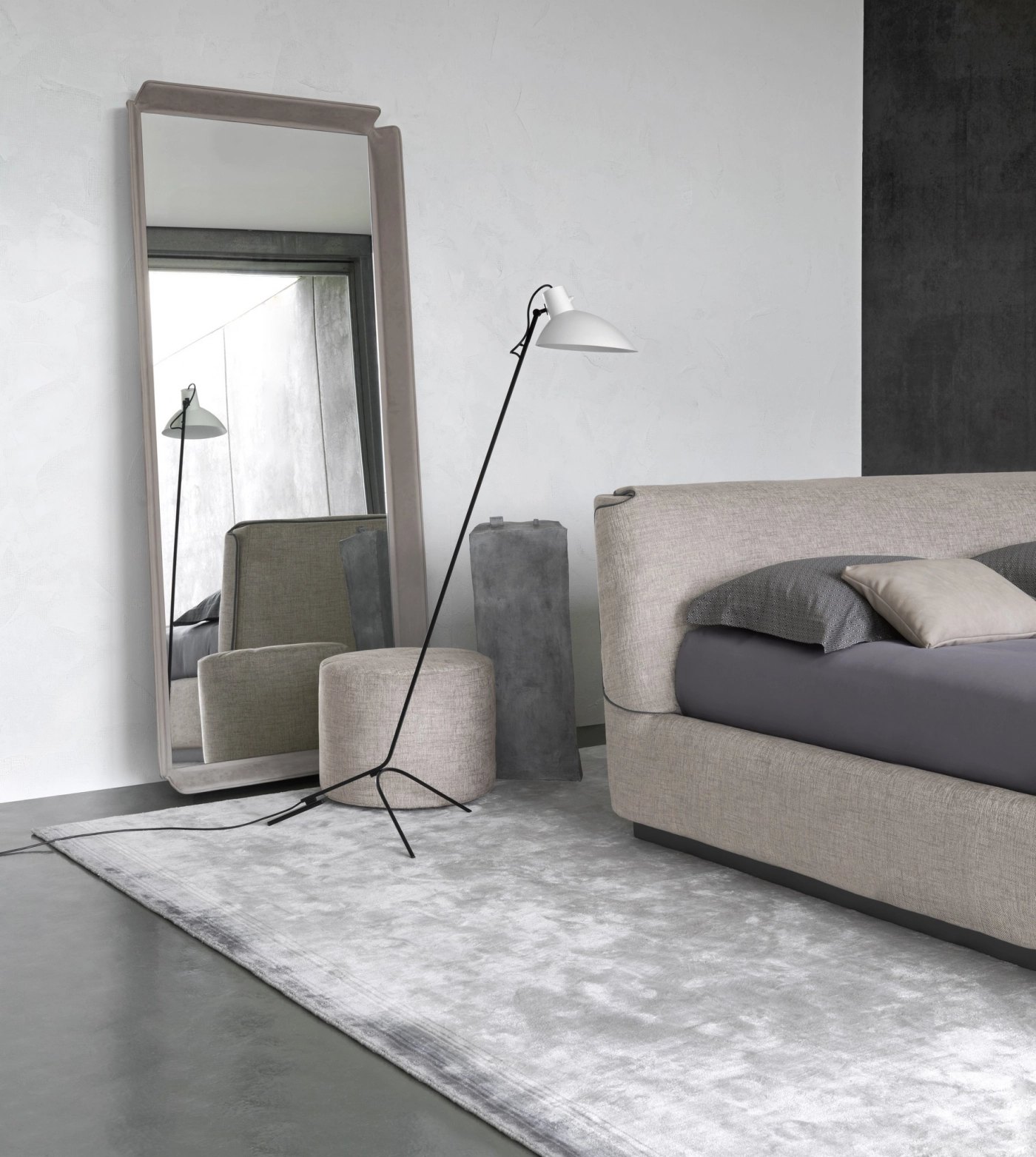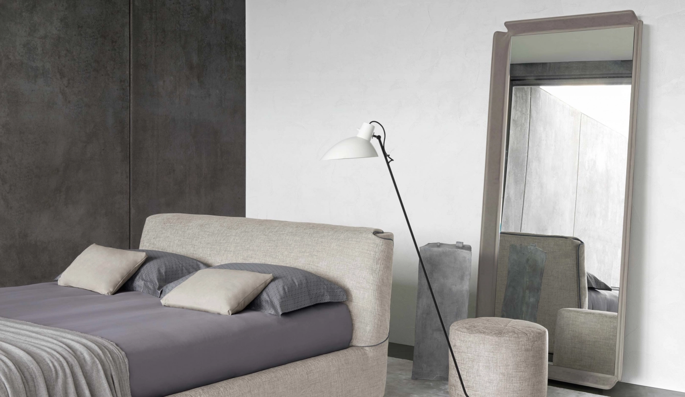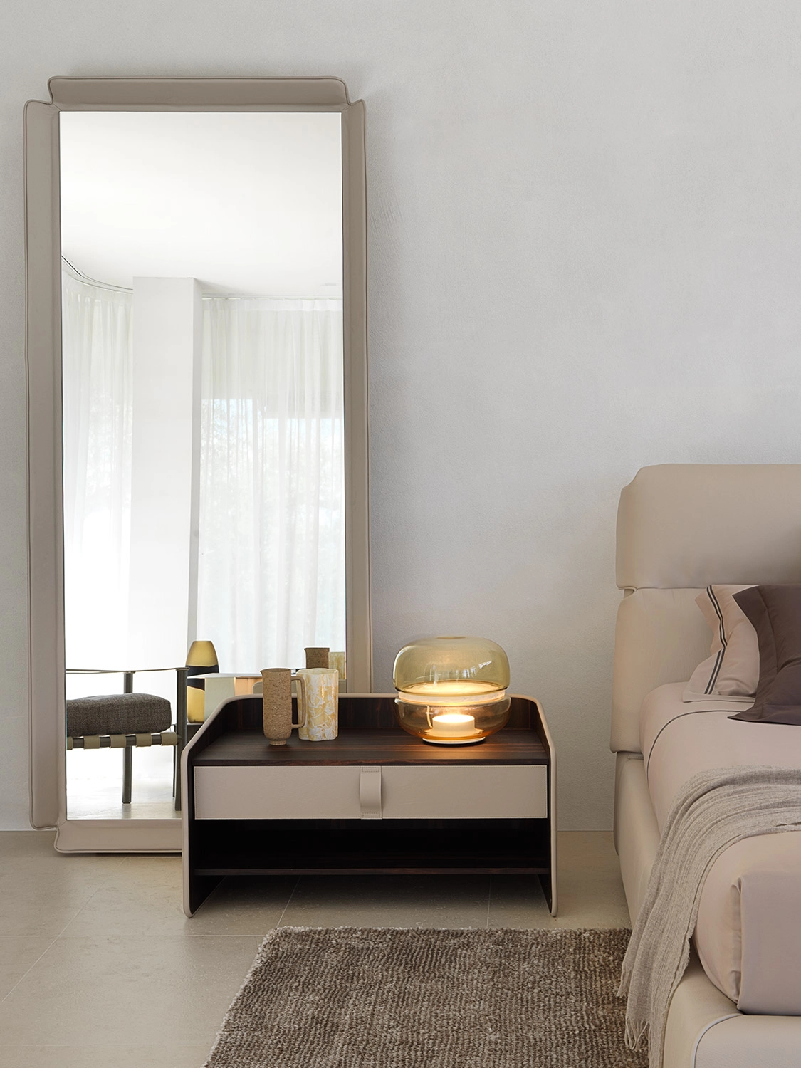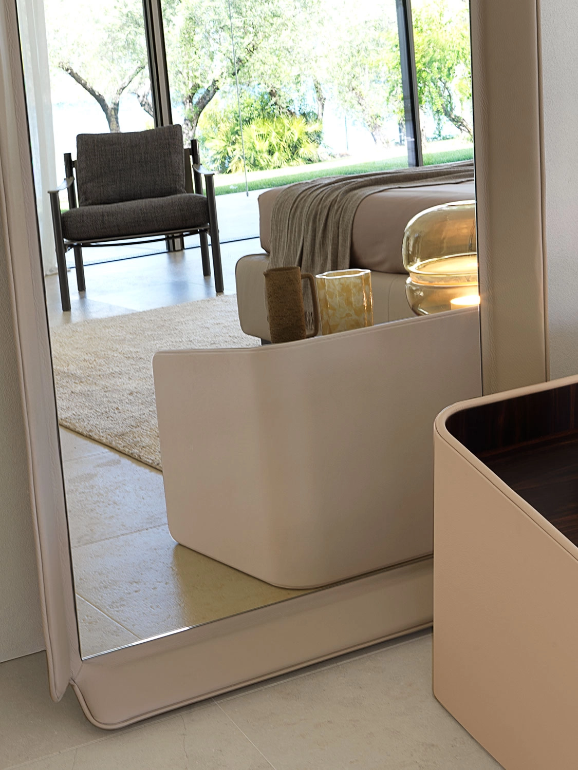 This elegant vertical mirror has a large frame covered in leather, with leather piping (in the same color as the frame or in a contrasting color) and is fitted with robust hooks for fixing the mirror to the wall.