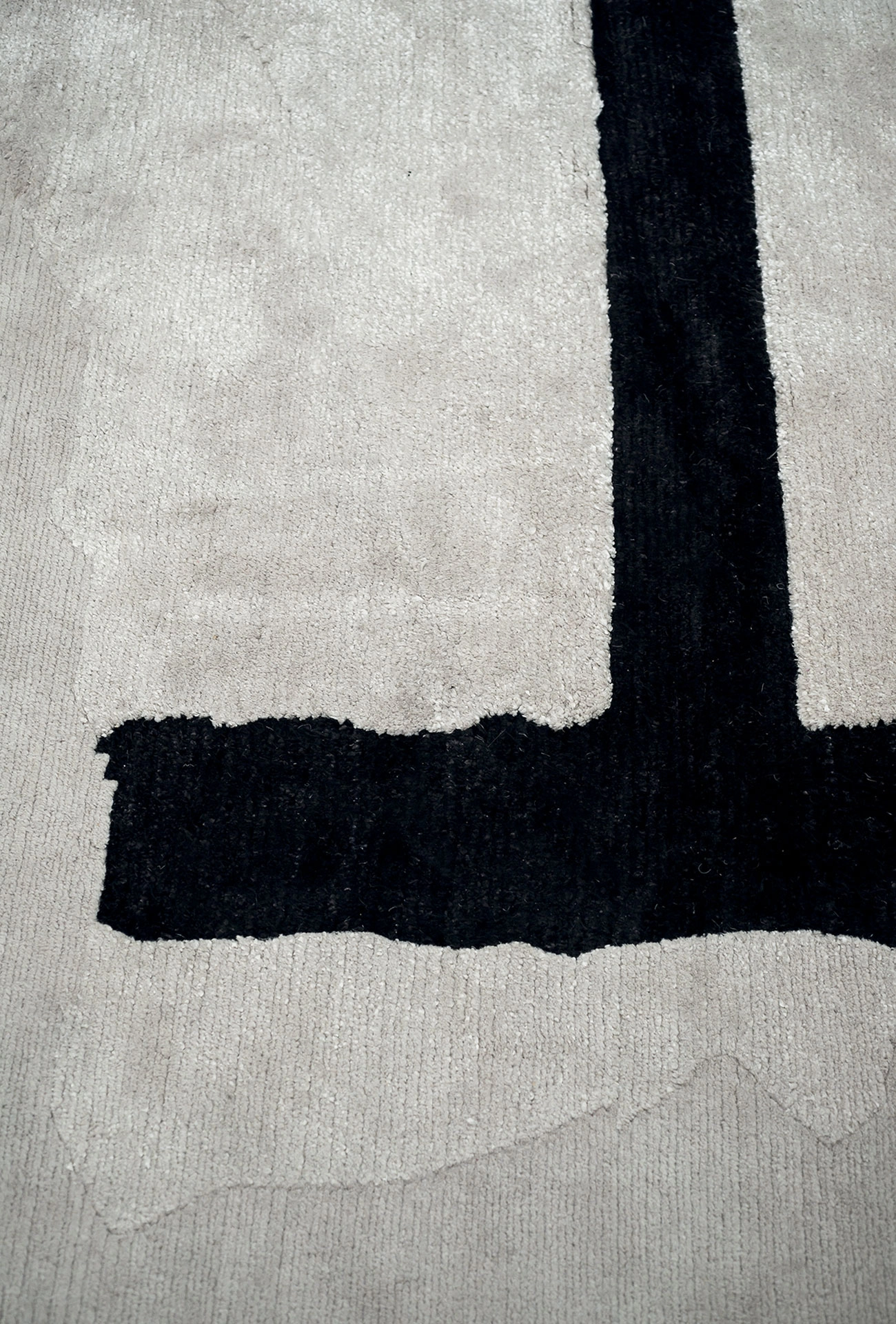 This rug is completely hand-knotted in Kathmandu, Nepal. Weft and warp in cotton and hand-spun and hand-carded Tibetan wool (800gr/mq cotton, 60% wool and 30% Indian “sari silk”). The fleece is knotted with the “cut pile” technique and refined on different levels.
