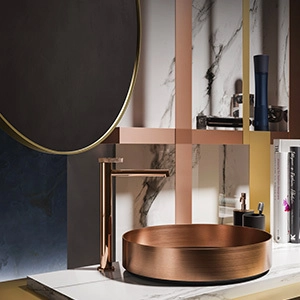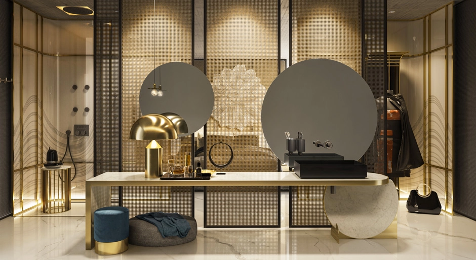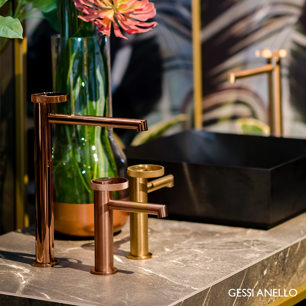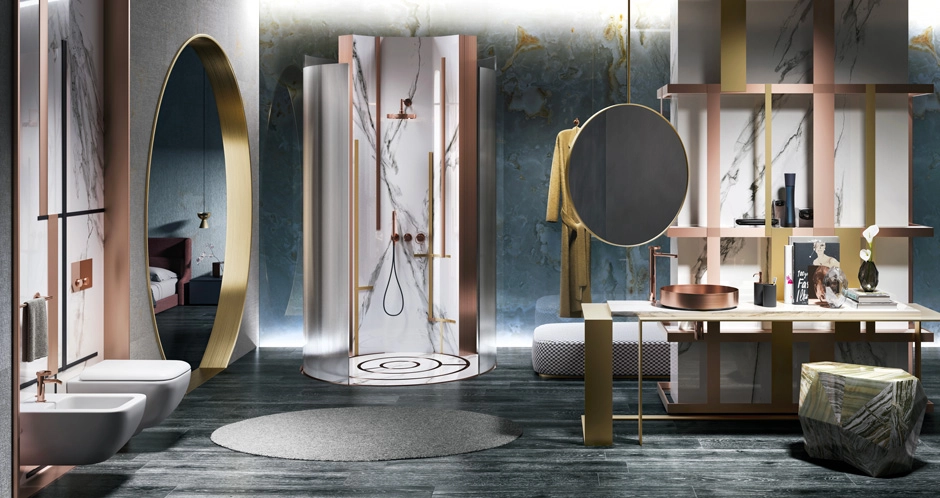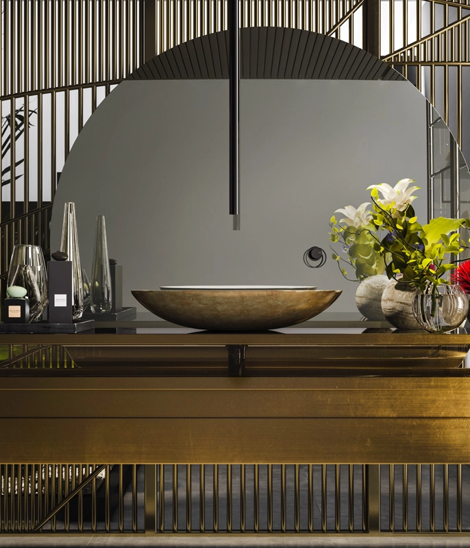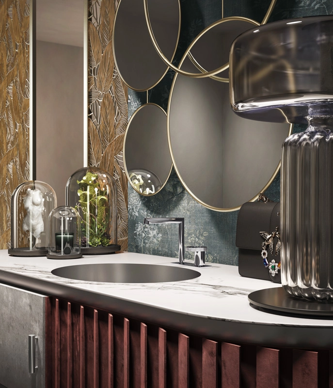 A pure figure, a circular physiognomy, a stylistic innovation that testifies to a physical and emotional bond. The bathroom is a place to relax after a stressful day or to spend some time before leaving the house.Anello is a jewel, something precious that plays on the customization of the decoration and on the alternation of solids and voids, making it elegant, current and at the same time suitable for any stylistic solution. Harmony and gestures at the first touch, Anello gives grace and elegance to everyday life for a feminine lines total look, a game of geometric and sinuous volumes.Tradition and modernity, soft lights, fabrics with warm tones and dividing panels with warm shades involve the viewer in a peaceful and comfortable atmosphere. From lacquered furniture, or in prestigious lineages, to rich warps, the bathroom be- comes a place to find harmony and balance, an intimate refuge where you can rediscover the pleasure of the self-ritual and the passing of time.