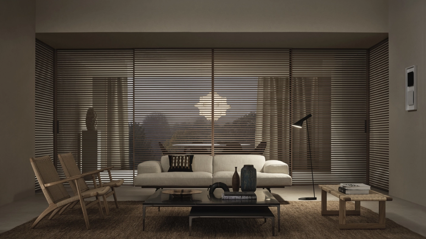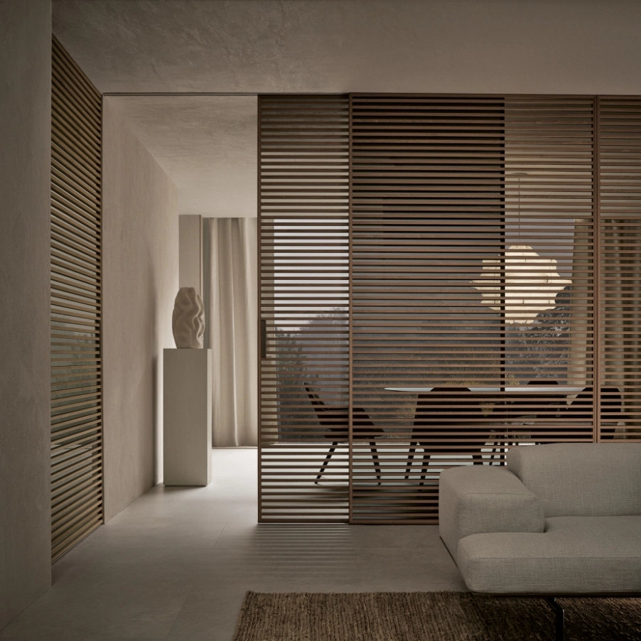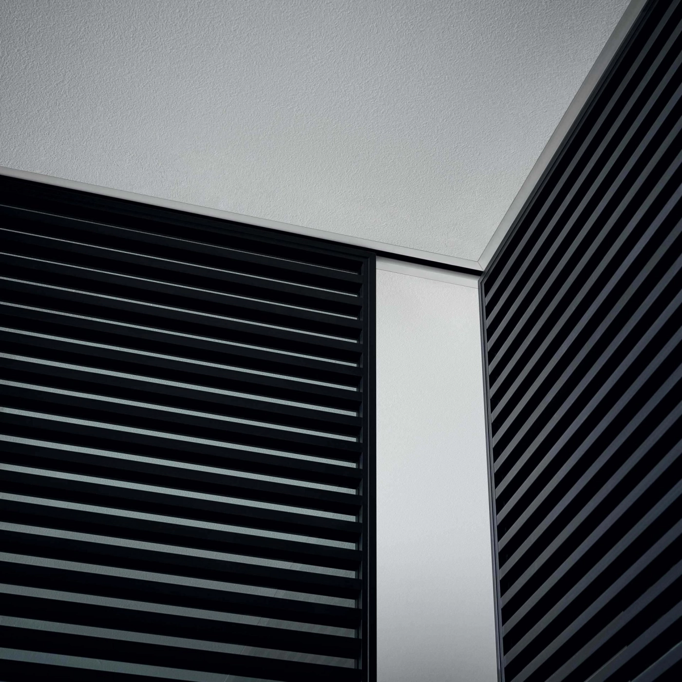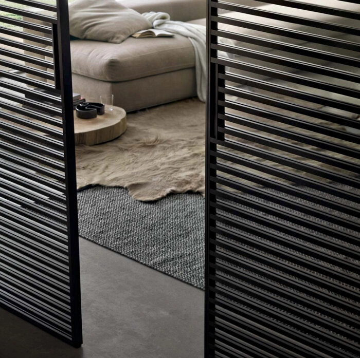 The typical aluminium crosspieces are installed on both sides of the panels, making them perfectly double-sided and ideal for any section of the house, from living to night areas, as well as for professional settings. A high graphic value solution, where the horizontal crosspieces give rhythm to the light passing from the glass panel with always different results.