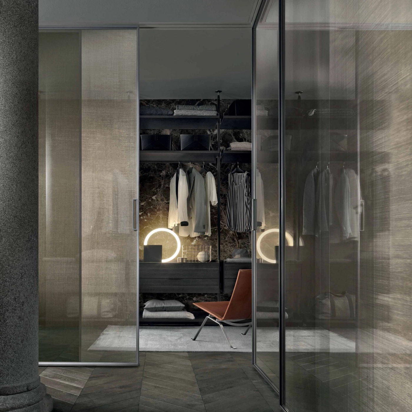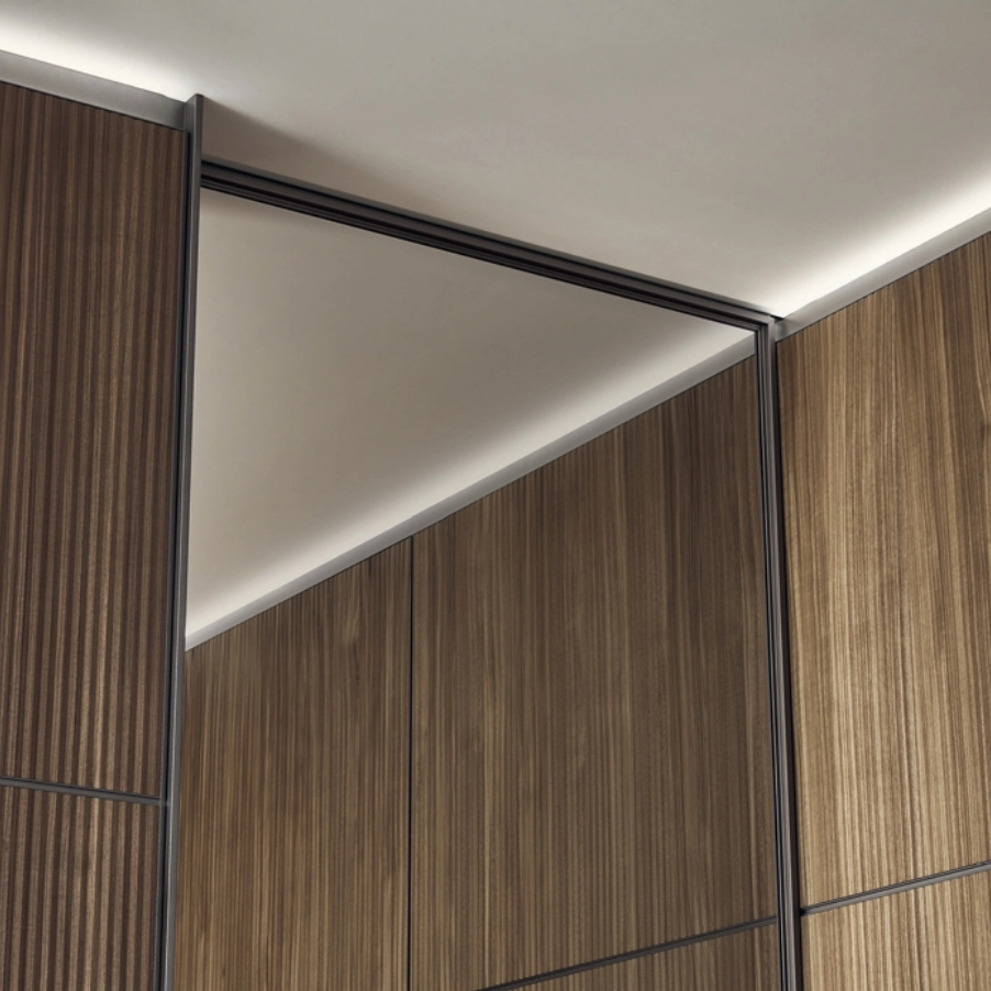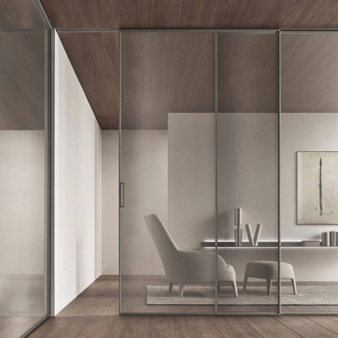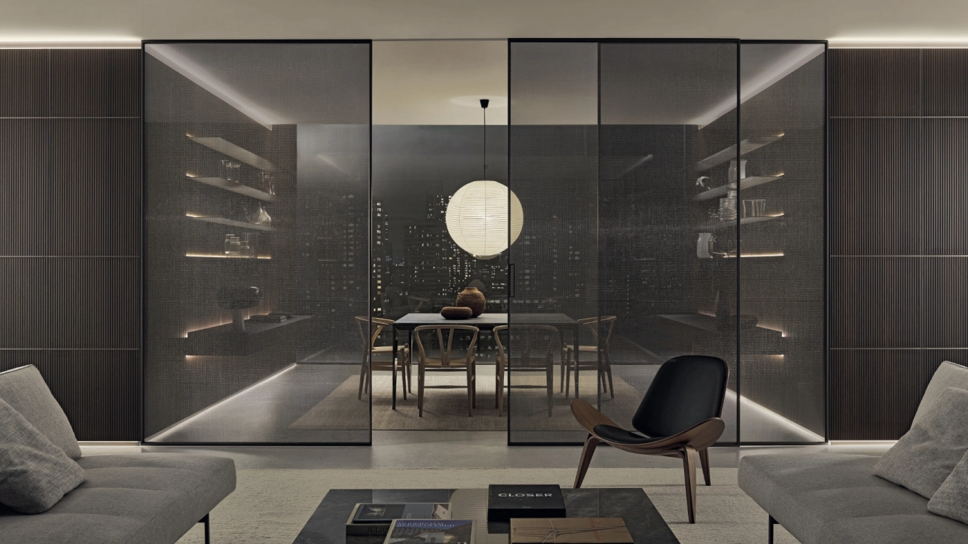 Sliding doors interpreted with the utmost geometrical rigour. In the project panels are always custom made with a structural profile in minimum thickness aluminium that makes the most of the exclusive aesthetic features of Rimadesio glass.