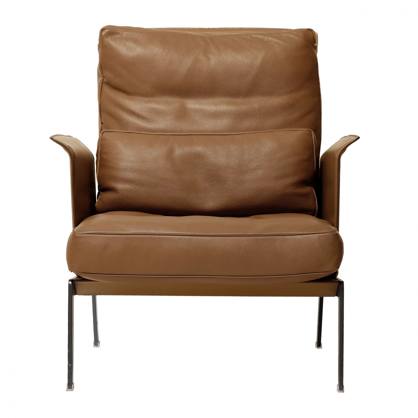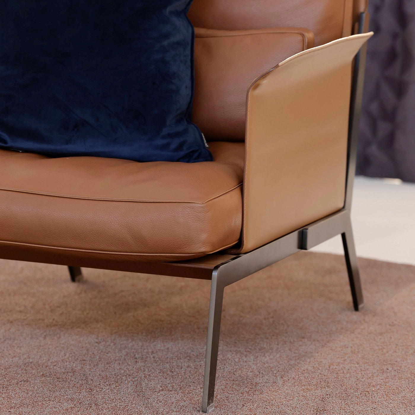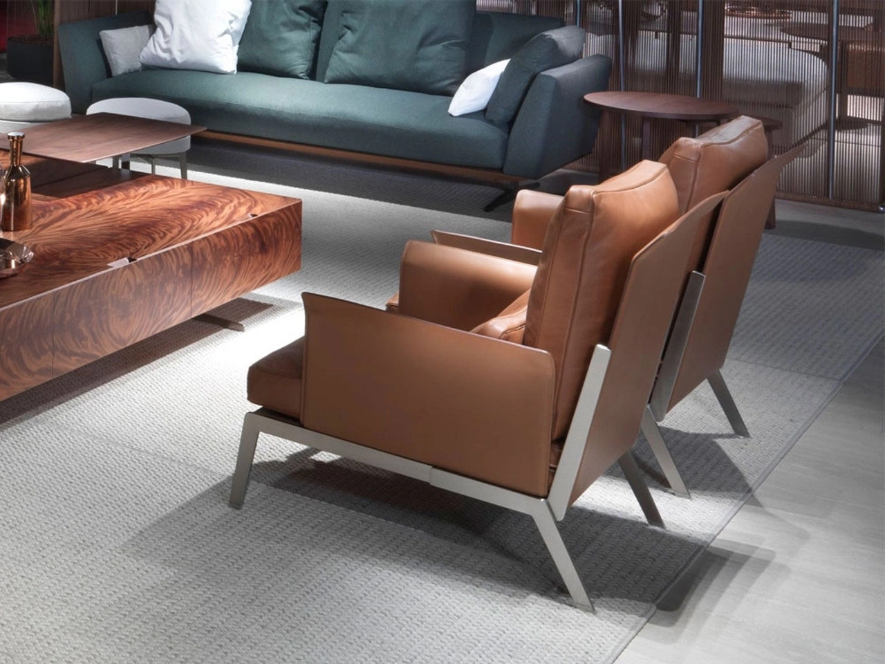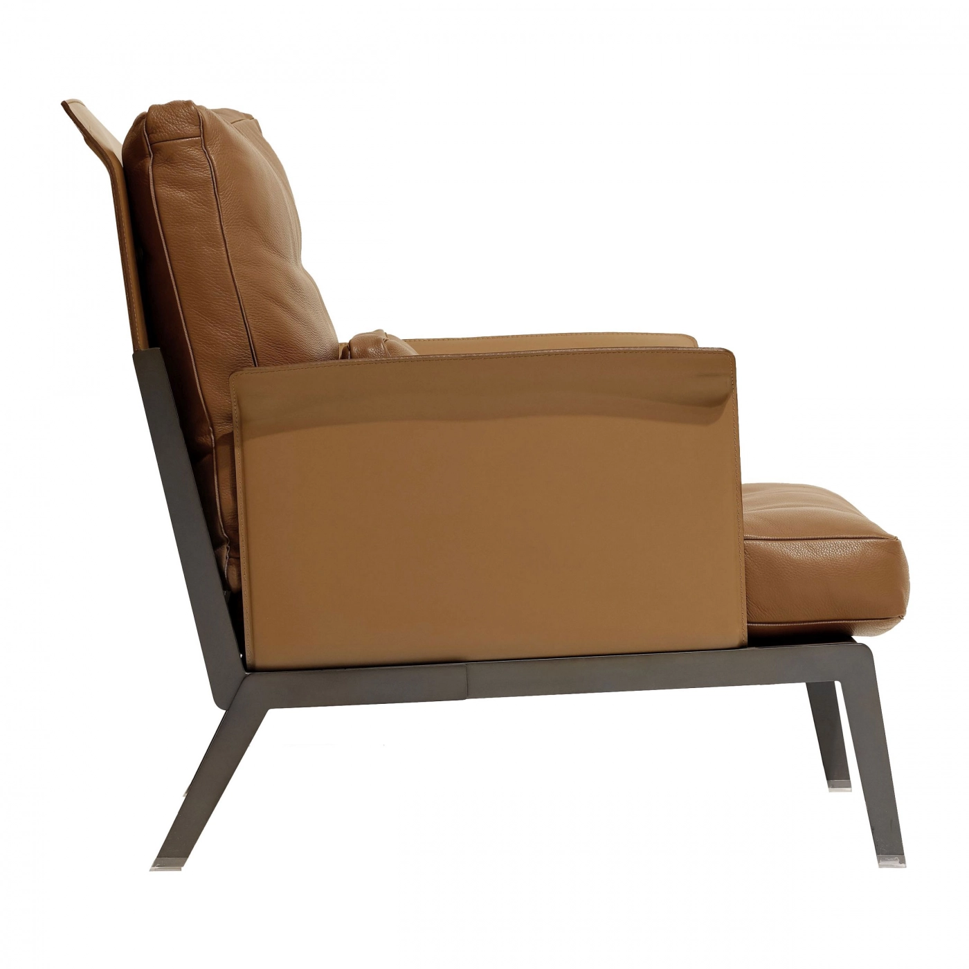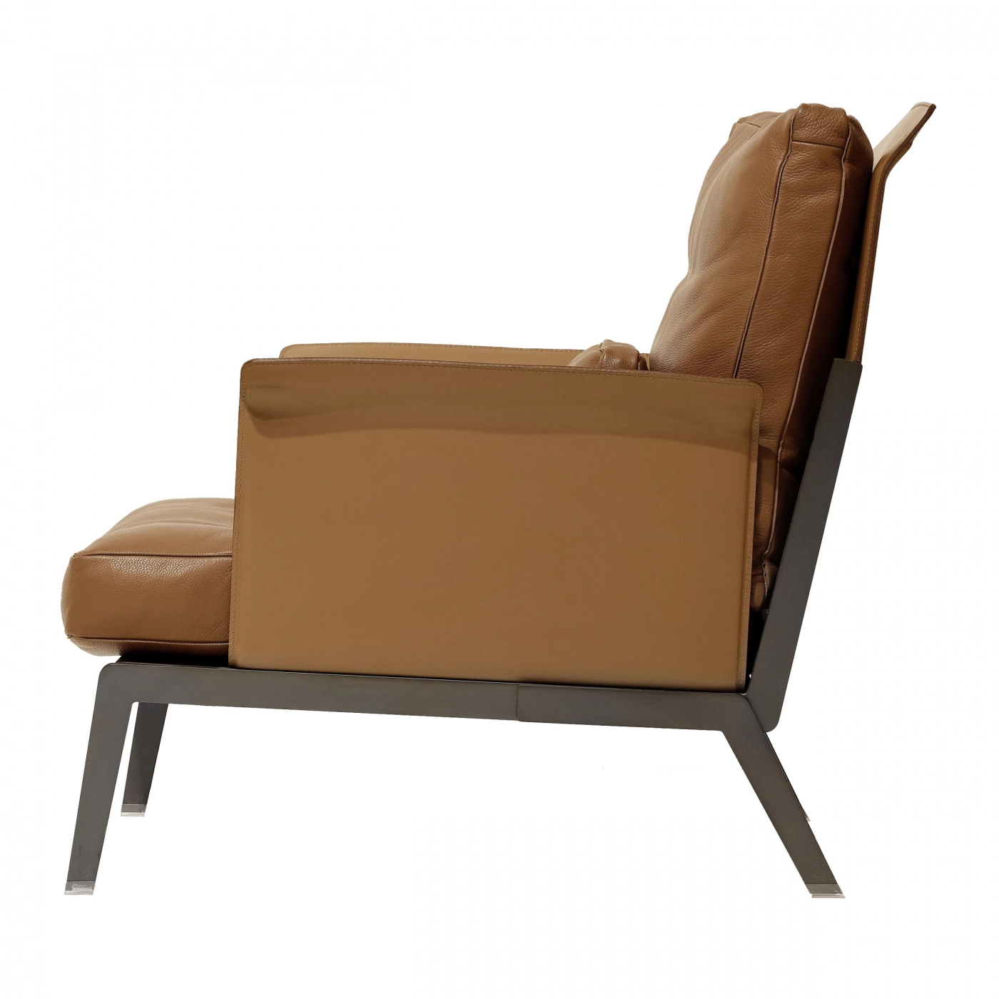 Happy-hour is an armchair whose clean, uncluttered lines express refined elegance through the choice of material: luxurious, pliable cowhide. The metal seat back and armrest structure is entirely upholstered in cowhide, while the elegant base is made of metal with satin, chrome, burnished, black chrome or champagne finish. Countless combinations can be achieved by pairing the cowhide structure with the soft seat and seat back cushions upholstered in any of the fabrics and leathers from the extensive Flexform collection.