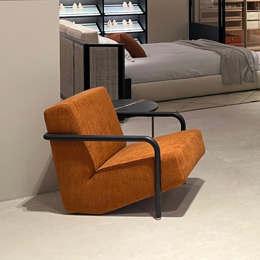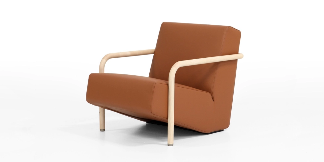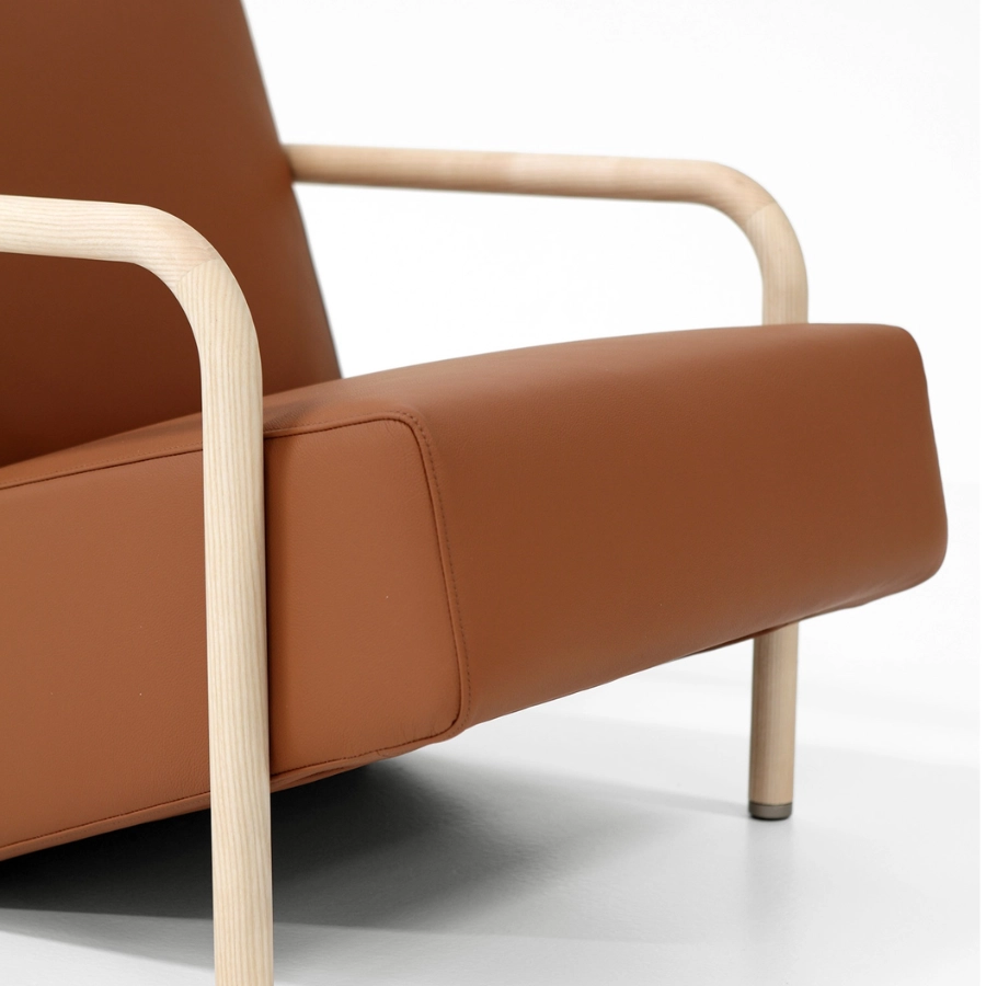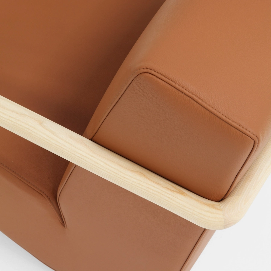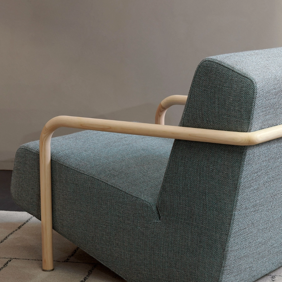 The small Lullaby lounge chair, with its unusual con guration and inclination, evokes the comfort and the act of cradling. Its immediate and pleasant-sounding name is almost onomatopoeic: the “L” recalls the shape of the wooden legs, while “U” identi es the couch on the floor plan, in addition to recall a rocking motion. Small object of desire with an off- plan shape that captures the gaze despite its small dimensions. Lullaby reveals sophisticated details behind its apparent simplicity, such as the small supporting foot in cuvée painted metal, the ash solid structure and the covering in soft fabric, leather or ecoleather. This is a particular homage by Porro and the designer to the Bauhaus and its diktat of reconciling functionalism and formal purism, in an ideal fusion of artisanal artistic creation and industrial production.