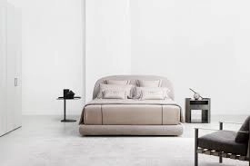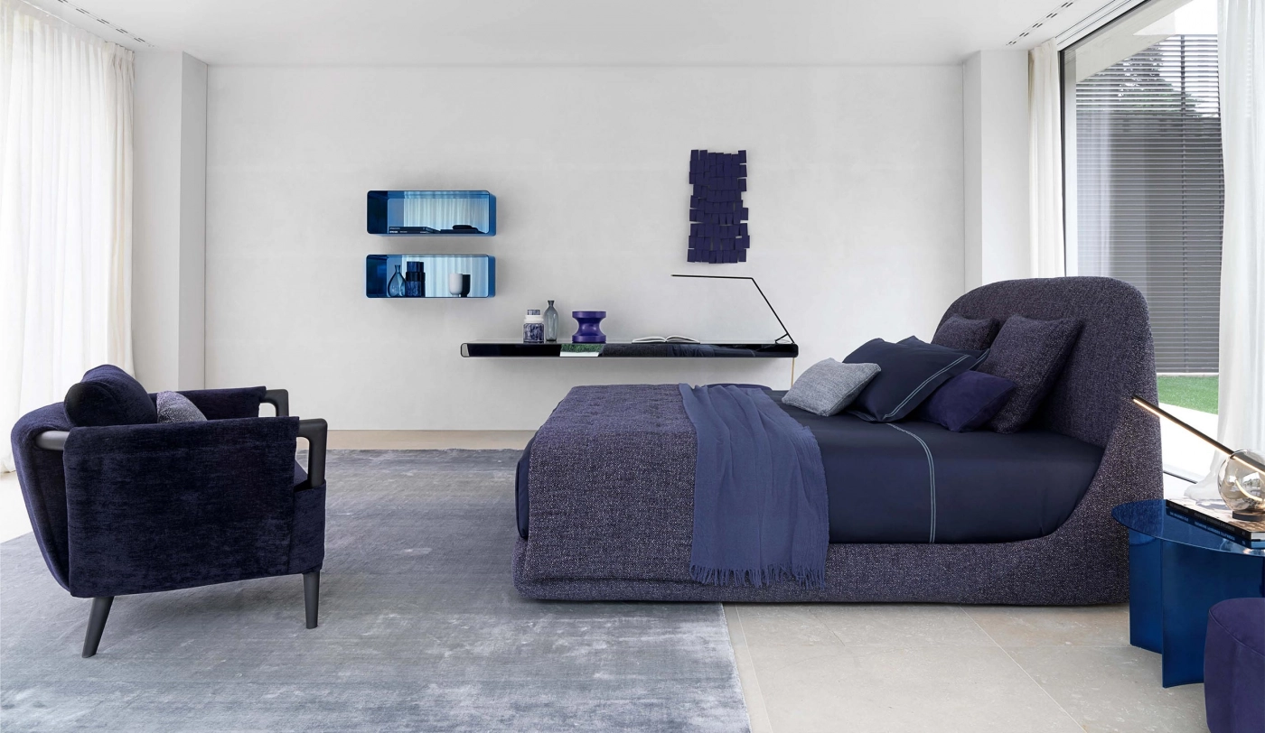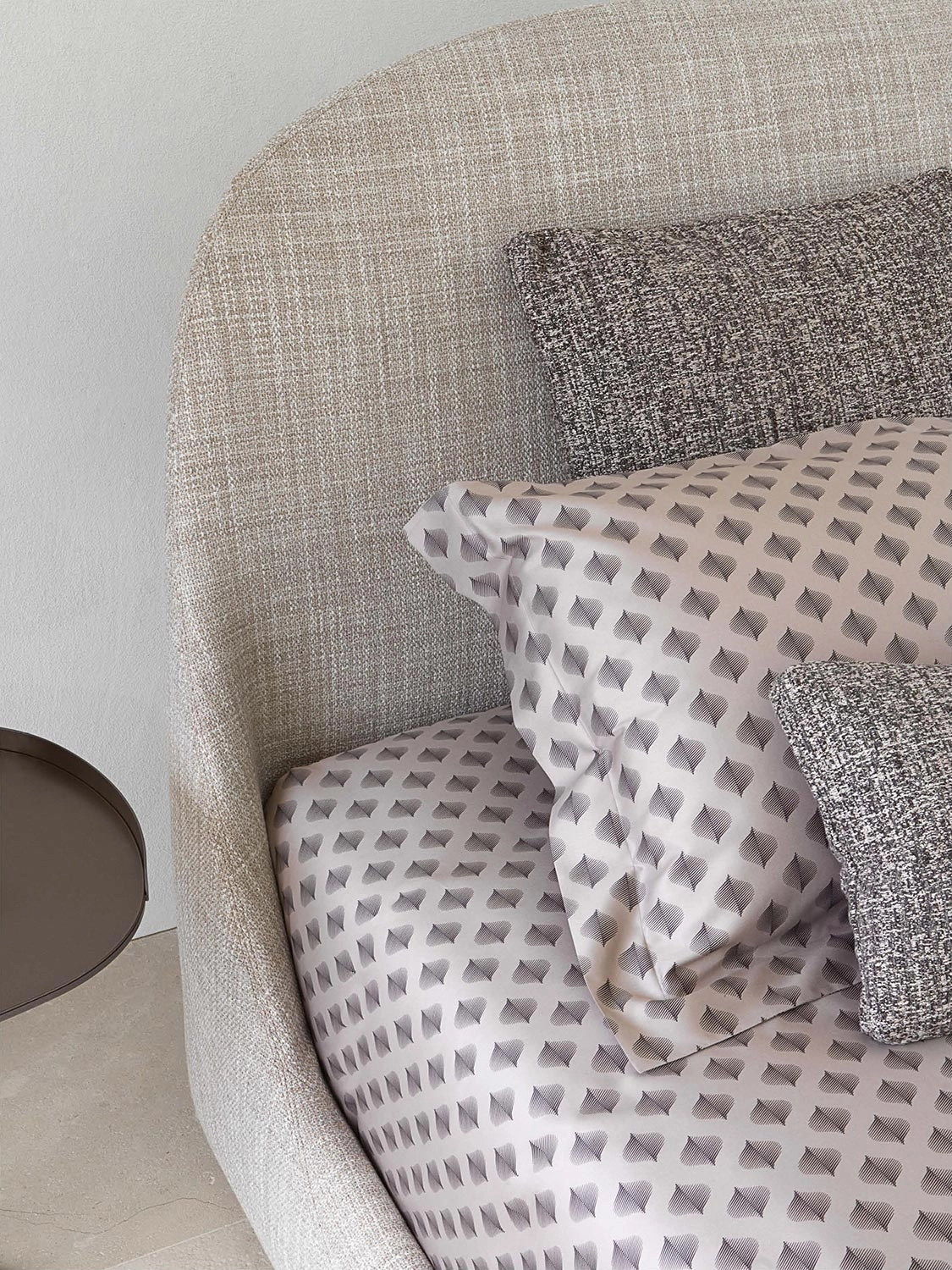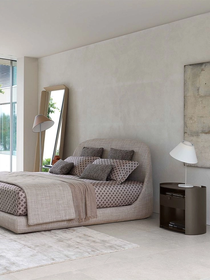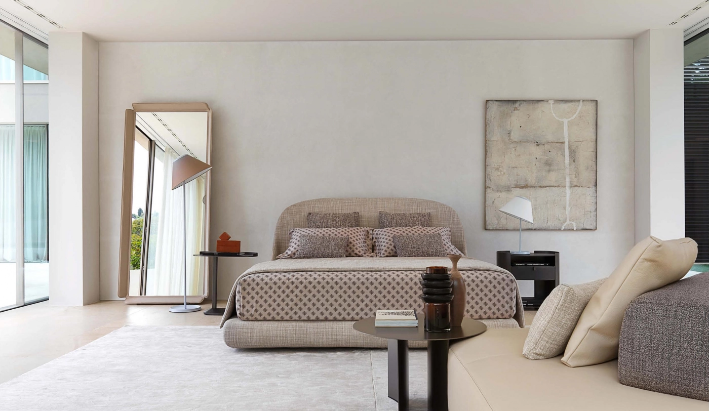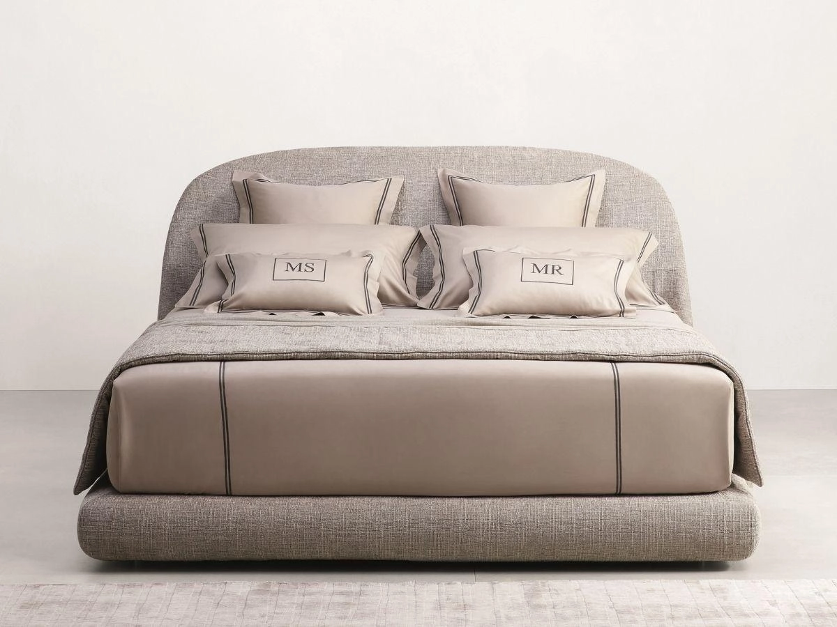 A double-size bed designed for extremely deep mattresses. A curved line forms the soft headboard, without continuity. Taormina was developed to offer customers a double-size bed for large mattresses that are deeper than standard. The shape of the bed clearly suggests relaxation and intimacy. The proportions of Taormina have been carefully studied to give the right emphasis to the comfort of the mattress without exaggerating the height, and furnish the bedroom with harmony and elegance. There is no continuity between the headboard and the bed base. Its soft generous and welcoming curve is highlighted by the exposed stitching along the edges.