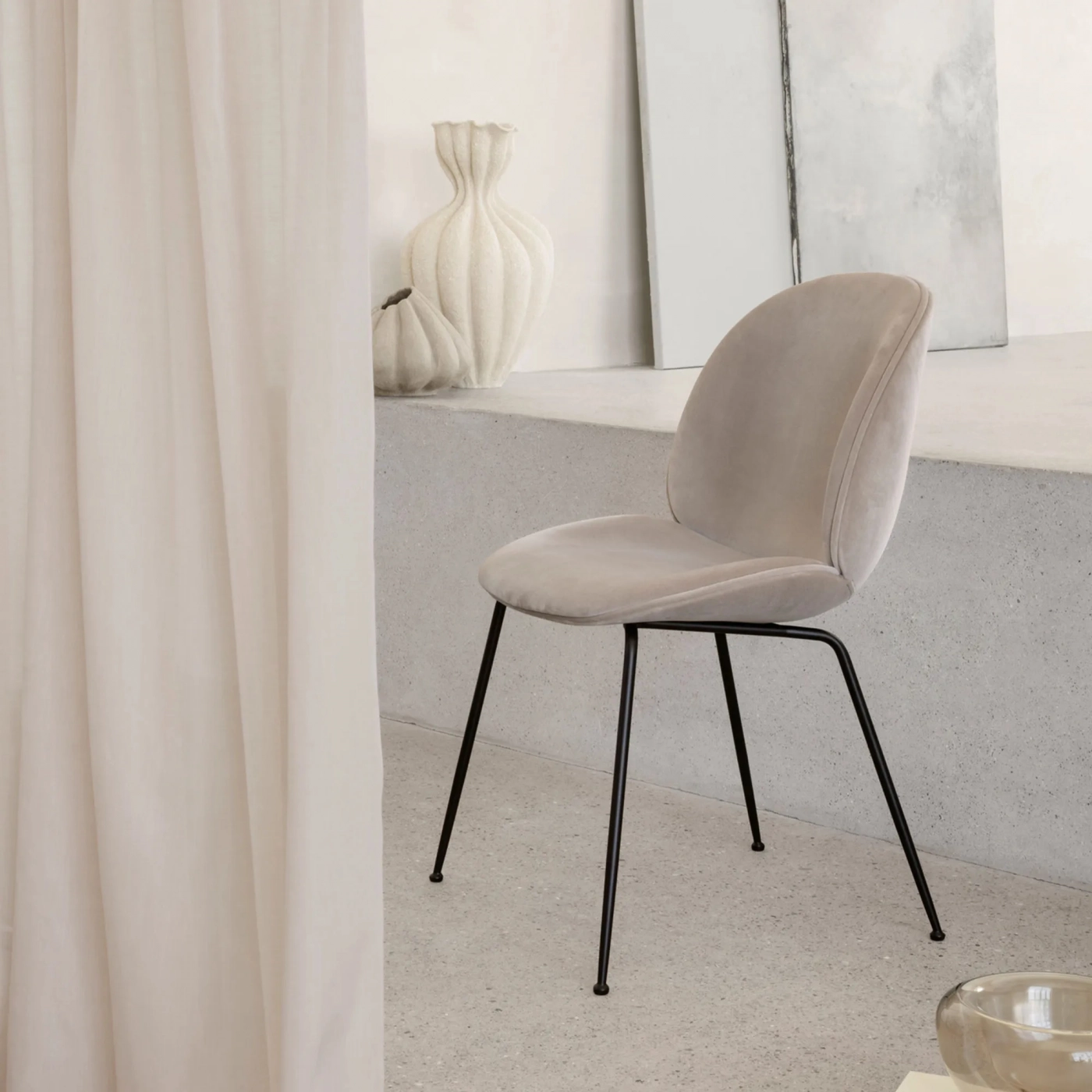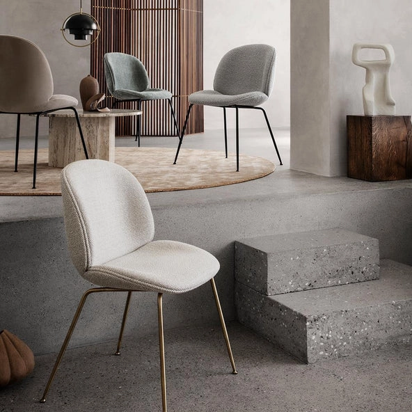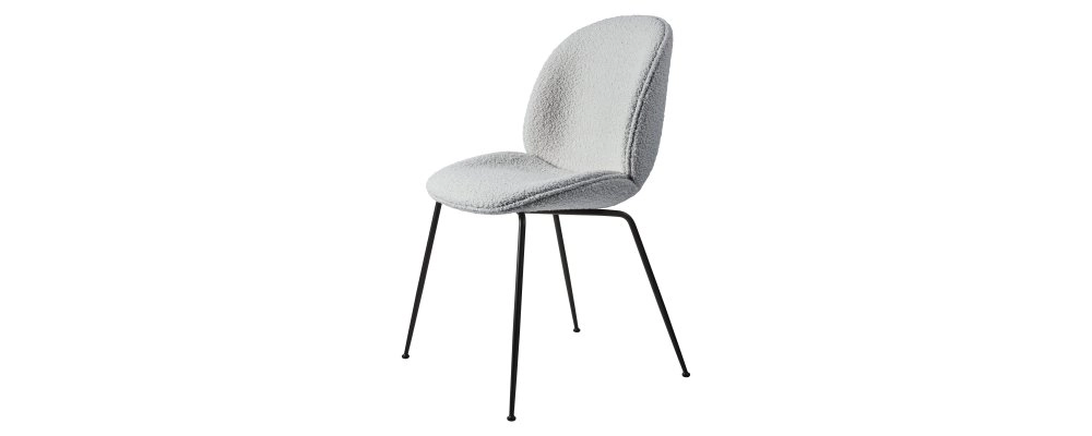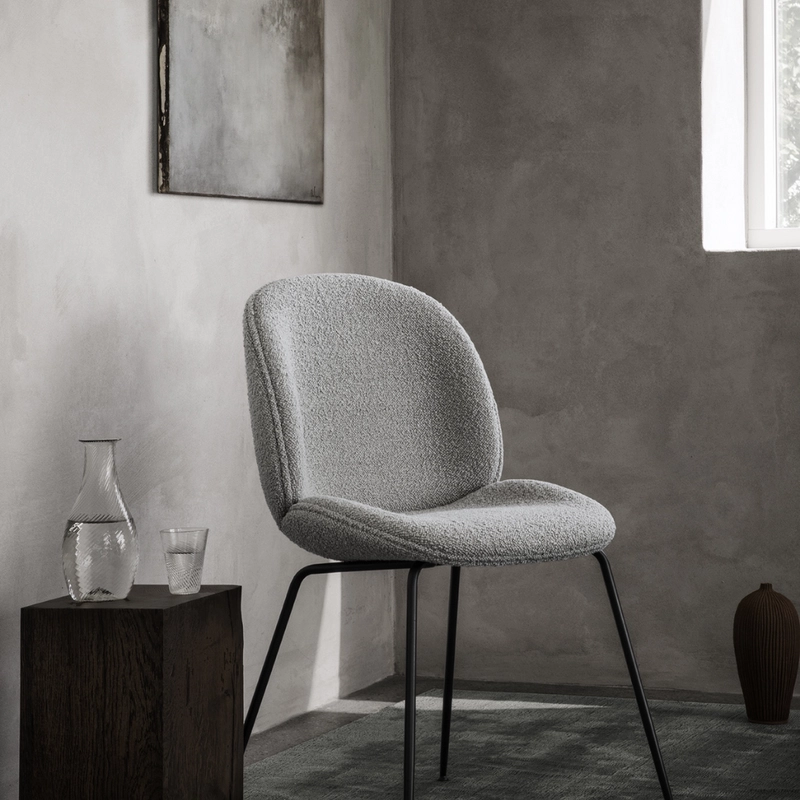 The Gamfratesi studio consists of Denmark’s Stine Gam and Italian Enrico Fratesi. Their work combines different influences, from classic Italian design to Scandinavian traditions. The Beetle chair is inspired by the shape of the scarab. The seat and back are made from two padded shells with curved lines that look like the insect's shell. The slim, tapered steel legs make reference to a beetle's le ...