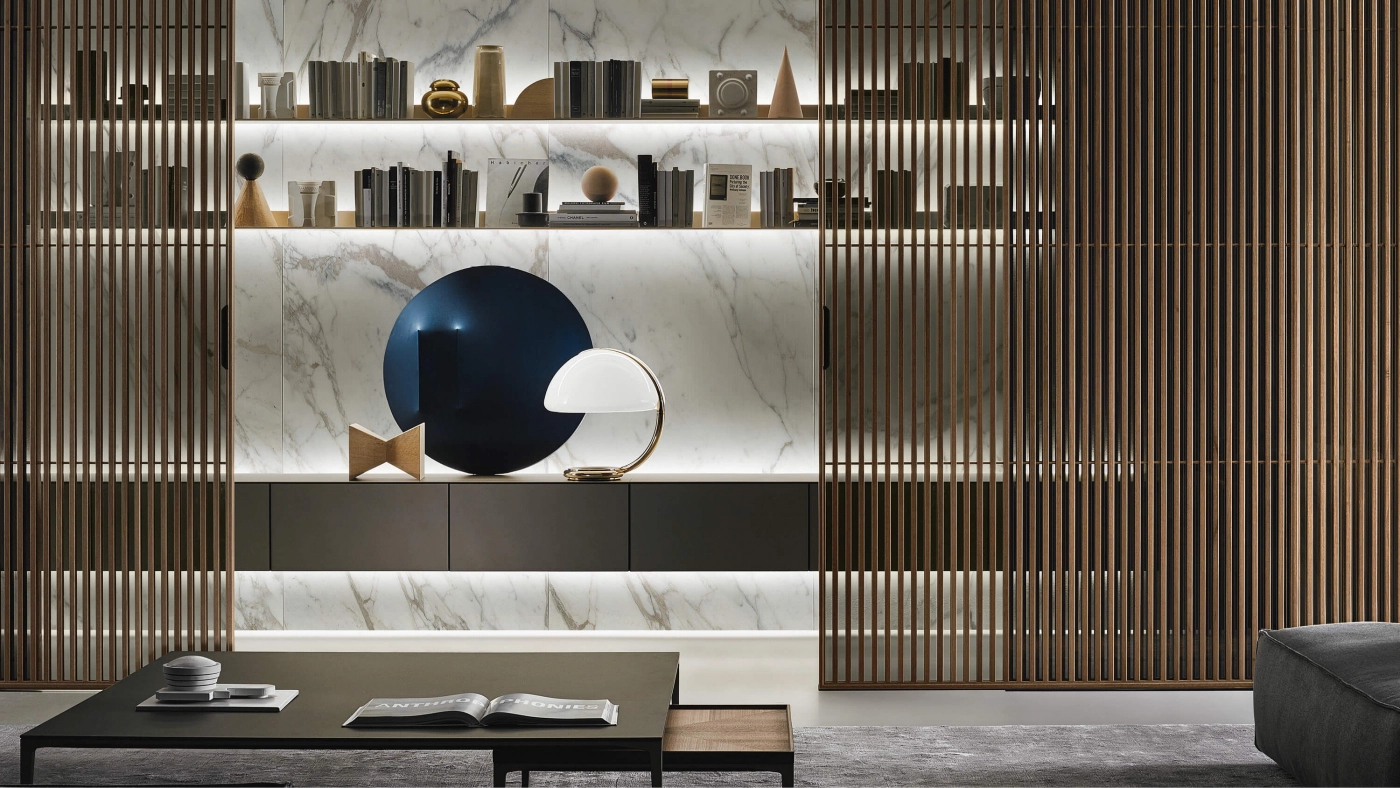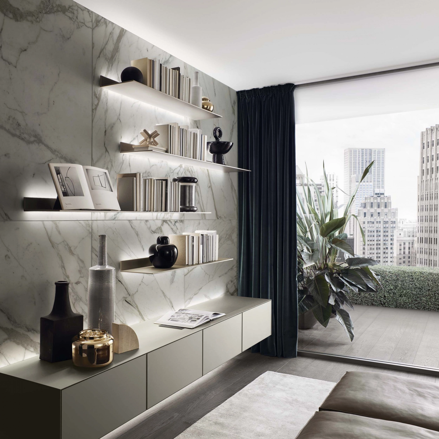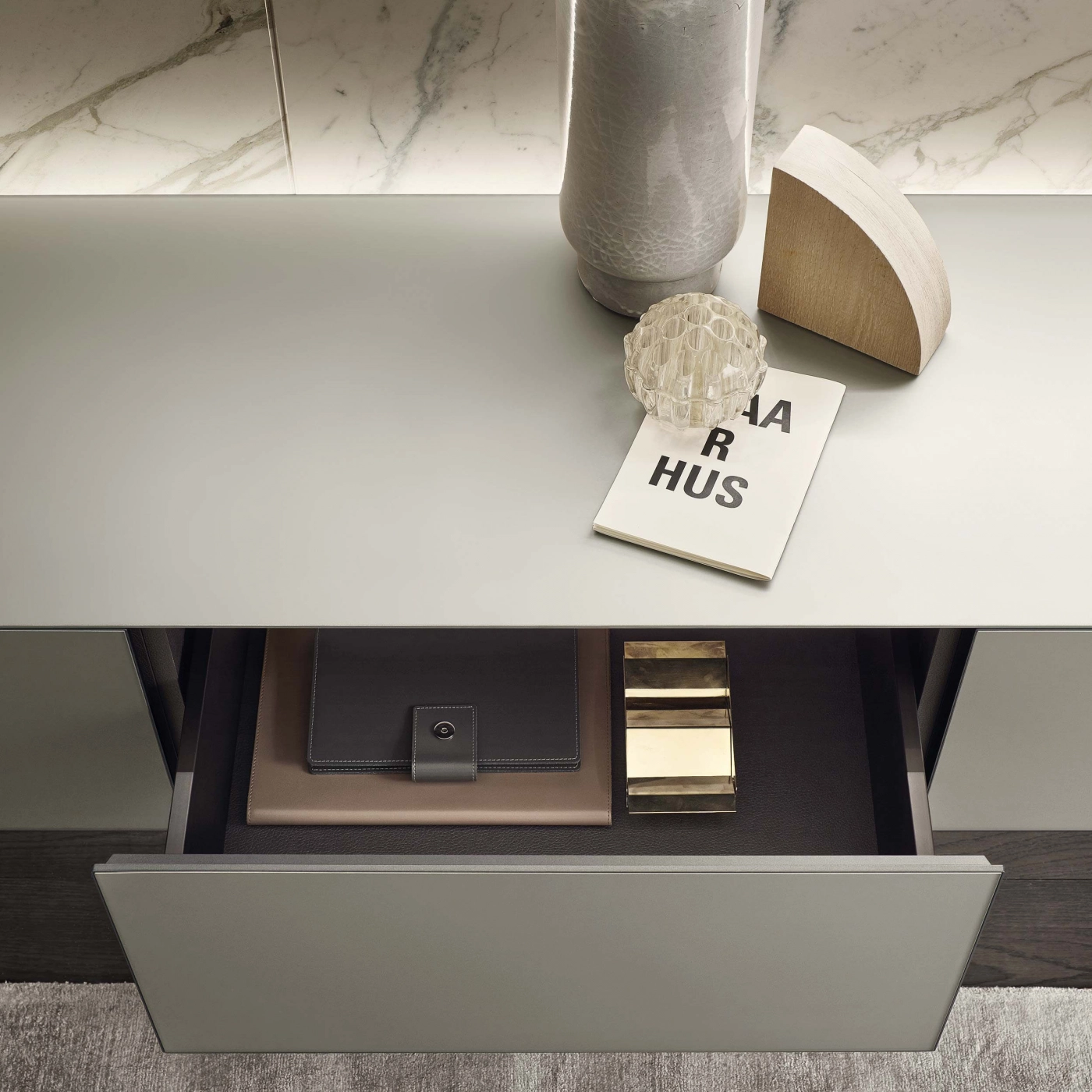 Self a modular system for each area of the house, which allows to create single and double-sided sideboards, tables, drawer units and suspended wall compositions. A project whose main quality is its versatility, combining the aesthetics of Rimadesio lacquered glass in all its variety of Ecolorsystem colours. Self can be freely designed, with modular horizontal compositions or vertical shaped cabinets. The system consists of set of drawers and flap doors, completely covered by lacquered glass, and wooden open modules lacquered in Ecolorsystem finishing.
