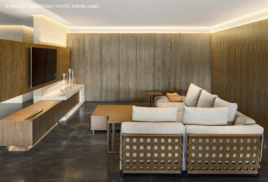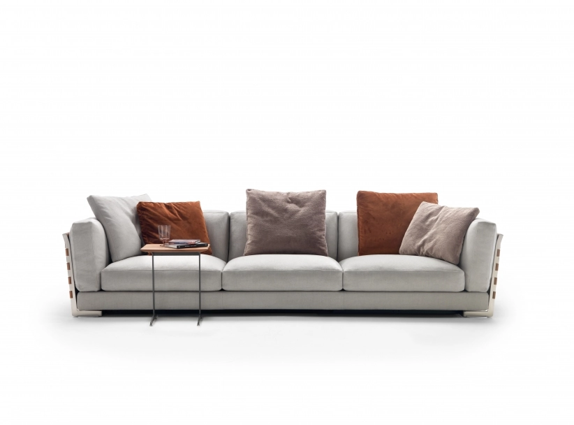 The Cestone sofa was designed to be placed at the center of the living room. In the spotlight are the sofa’s back and sides, parts that cannot usually be counted on to bring added value. Instead, the back and sides of the Cestone sofa are made up of a metal structure upholstered with woven strips of cowhide. Two options of the irregular woven pattern, with strips in two different widths, are available. The cowhide strips can be closely woven, forming a compact surface; or more loosely woven, allowing the underlying upholstery fabric to show through. The resulting ‘checkerboard’ pattern makes a strong visual statement in aesthetically pleasing contrast to the soft, perfectly-proportioned upholstered parts.