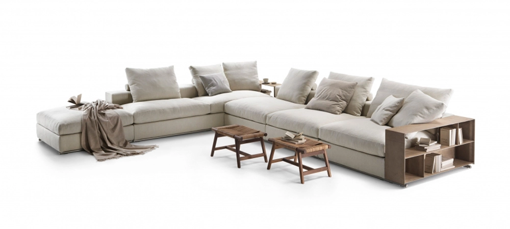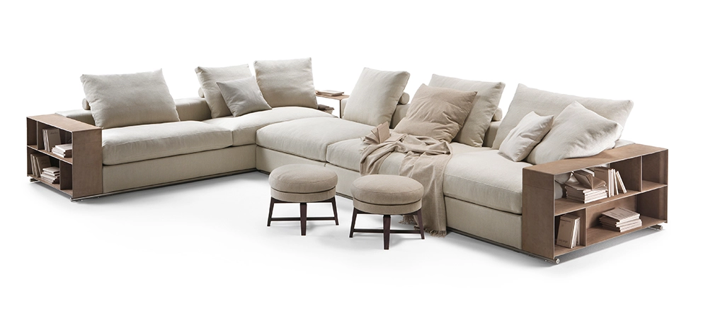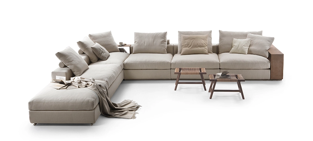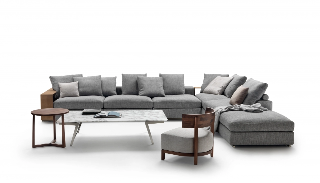 An undeniable best-seller from the Flexform collection, Groundpiece has transformed the very concept of the sofa, introducing several innovations. First of all, it is a deconstructed line with new proportions – the Groundpiece sofa is low and deep, designed as a more relaxed and casual approach to seating. Groundpiece embodies the quintessence of Flexform comfort and is exceptionally inviting, thanks to the amply-sized goose-down cushions. Groundpiece also allows for the utmost personalization of the padded elements that can be crafted in goose down, in the premium version, or in Dacron.