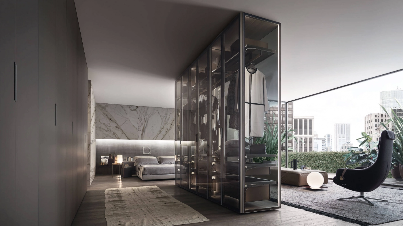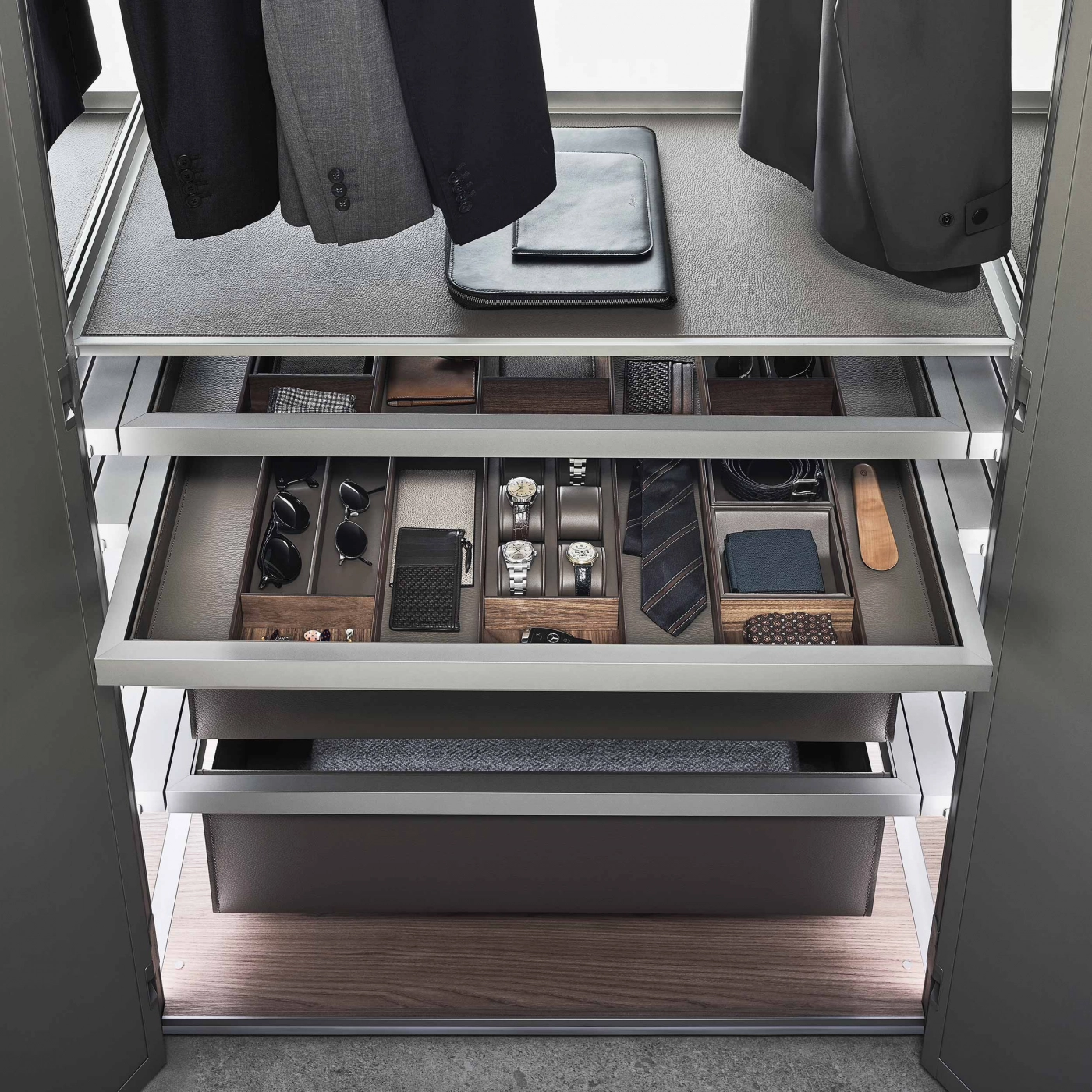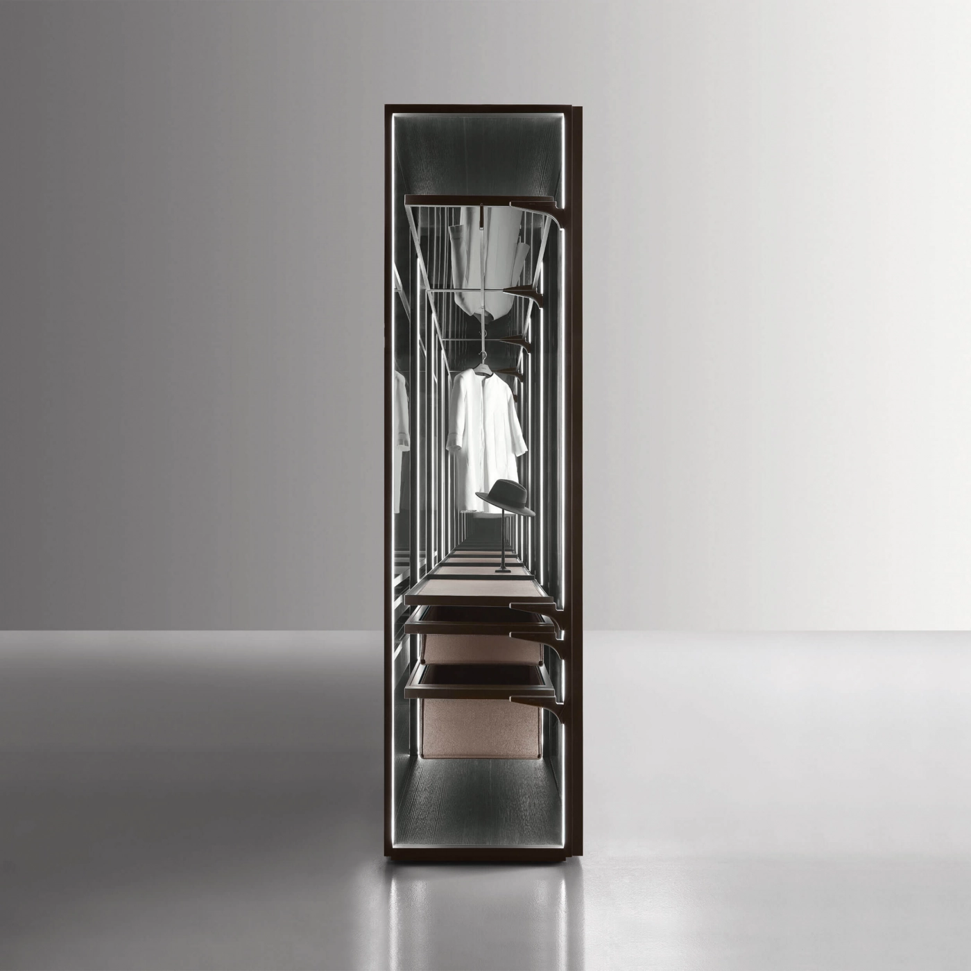 Cover freestanding is the self-supporting version of the Cover system, therefore equipped with side panels and back panels, thus creating linear or corner compositions, always custom made.The perfect finish of the back panels and the inside of the doors make Cover freestanding an ideal system also for niche solutions, complete with integrated through way. The internal equipments are fixed directly to the uprights, without visible screws, which allows a free and easily adjustment over the time.