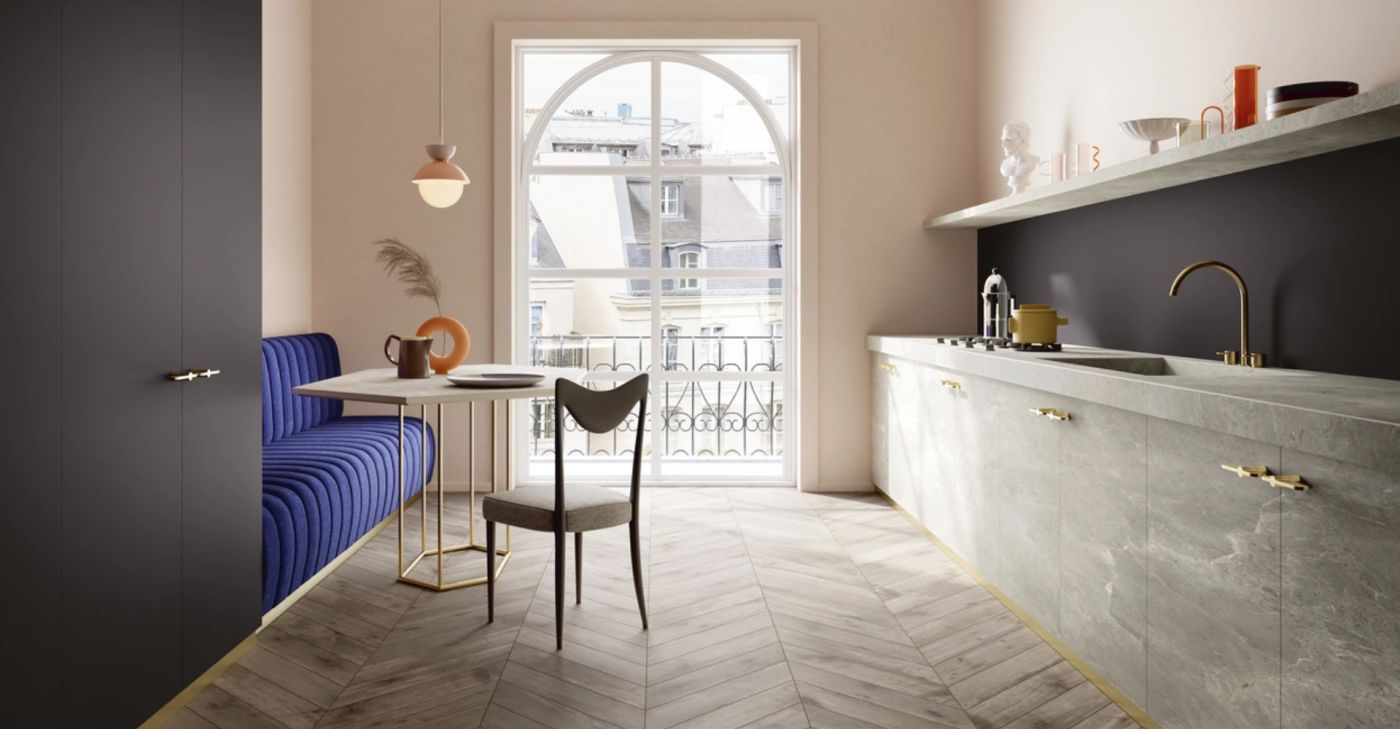 A supremely elegant yet warm ambiance with a retro touch, accentuated by the choice of contrasting materials for base and surfaces, such as Palladium Grey and Noir. The result is a welcoming, warm and bright room where you can enjoy a few moments of pleasant relaxation. Here and there splashes of color add vibrant warmth to joyous elegance, without ever sacrificing practicality. A comfortable sofa provides a well-deserved resting place after a hectic day at work.