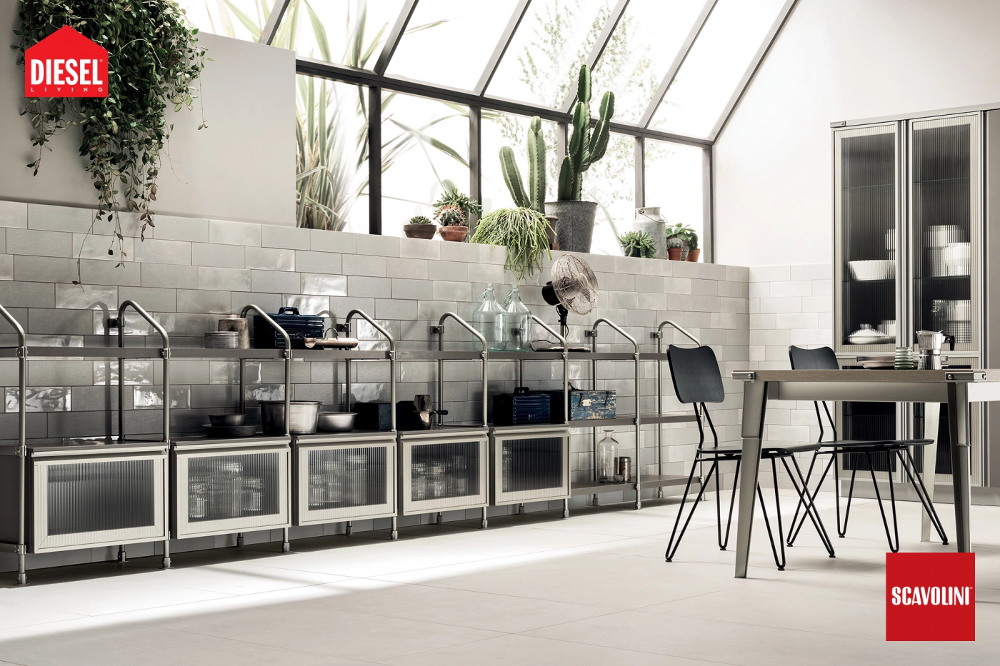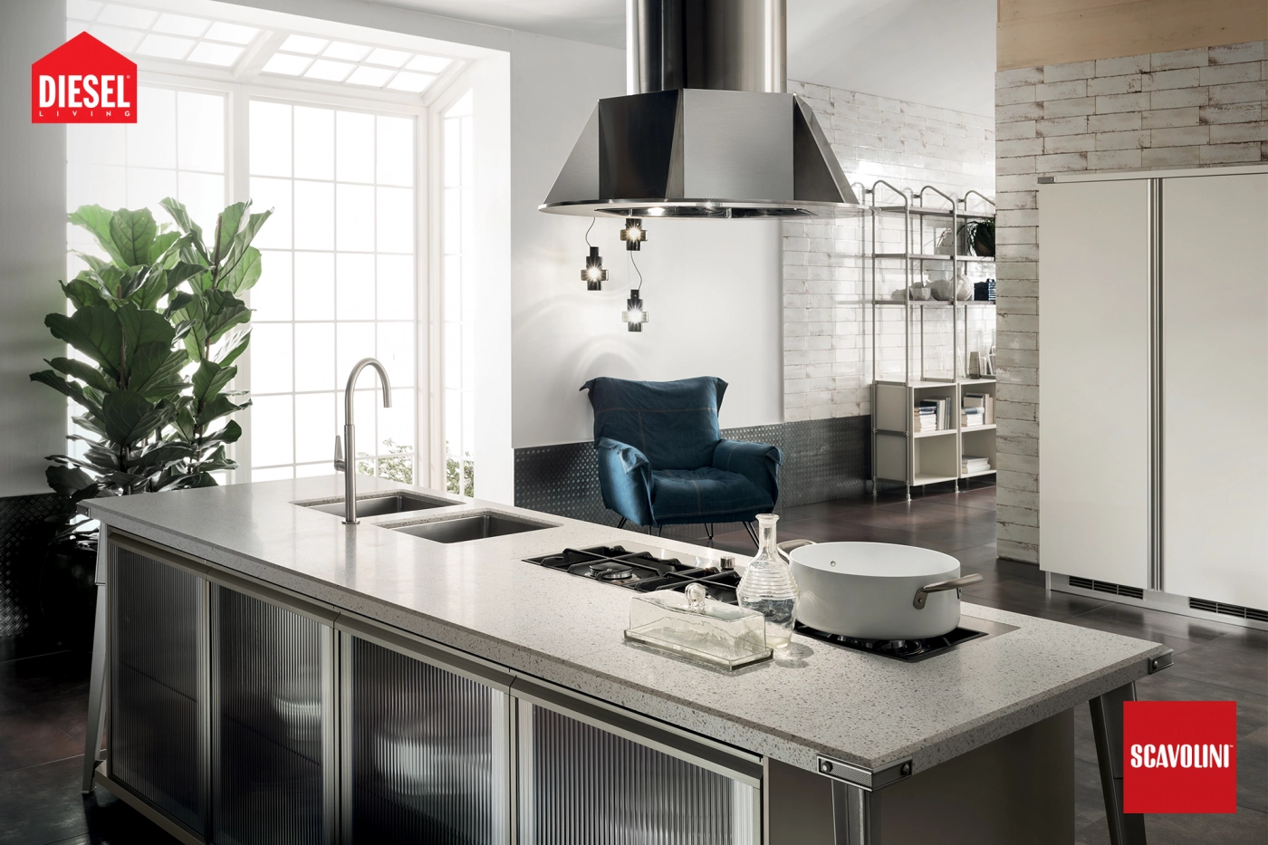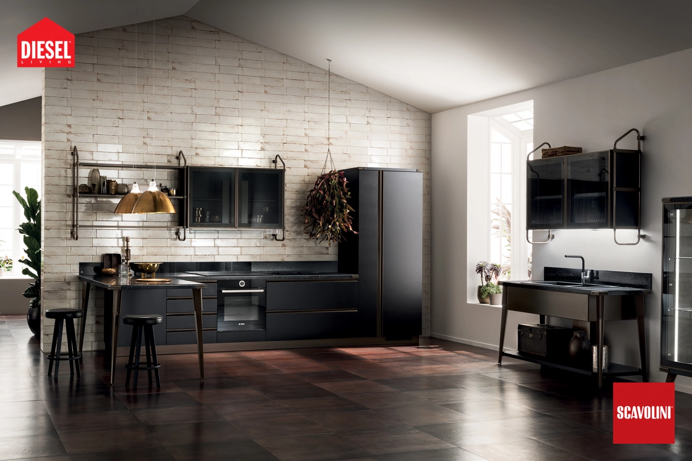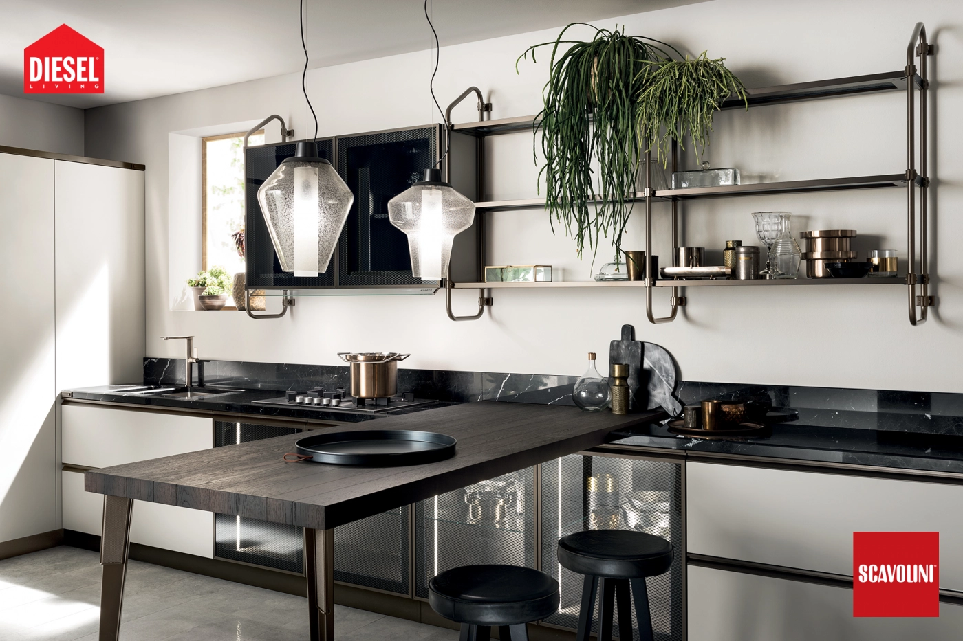 Industrial design finds a new balance. The result of a partnership between the Diesel Living team and Scavolini, Diesel Open Workshop is a new chapter following on from the astounding success of the Diesel Social Kitchen, "a new idea" that is set to be just as successful, if not outright more effective in evocative terms.Diesel Open Workshop: the kitchen restyled with an industrial twist.