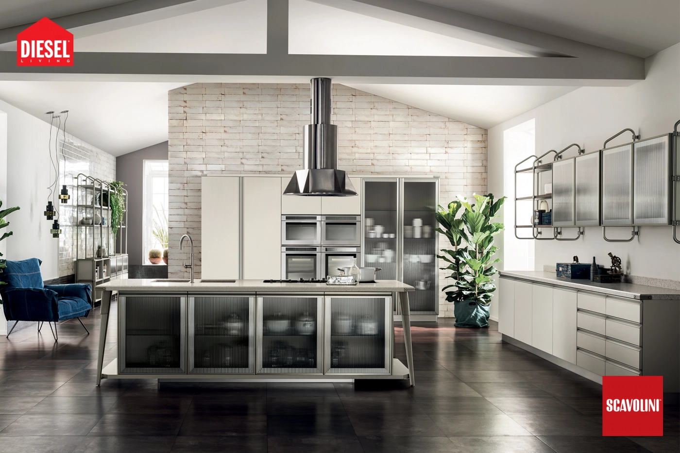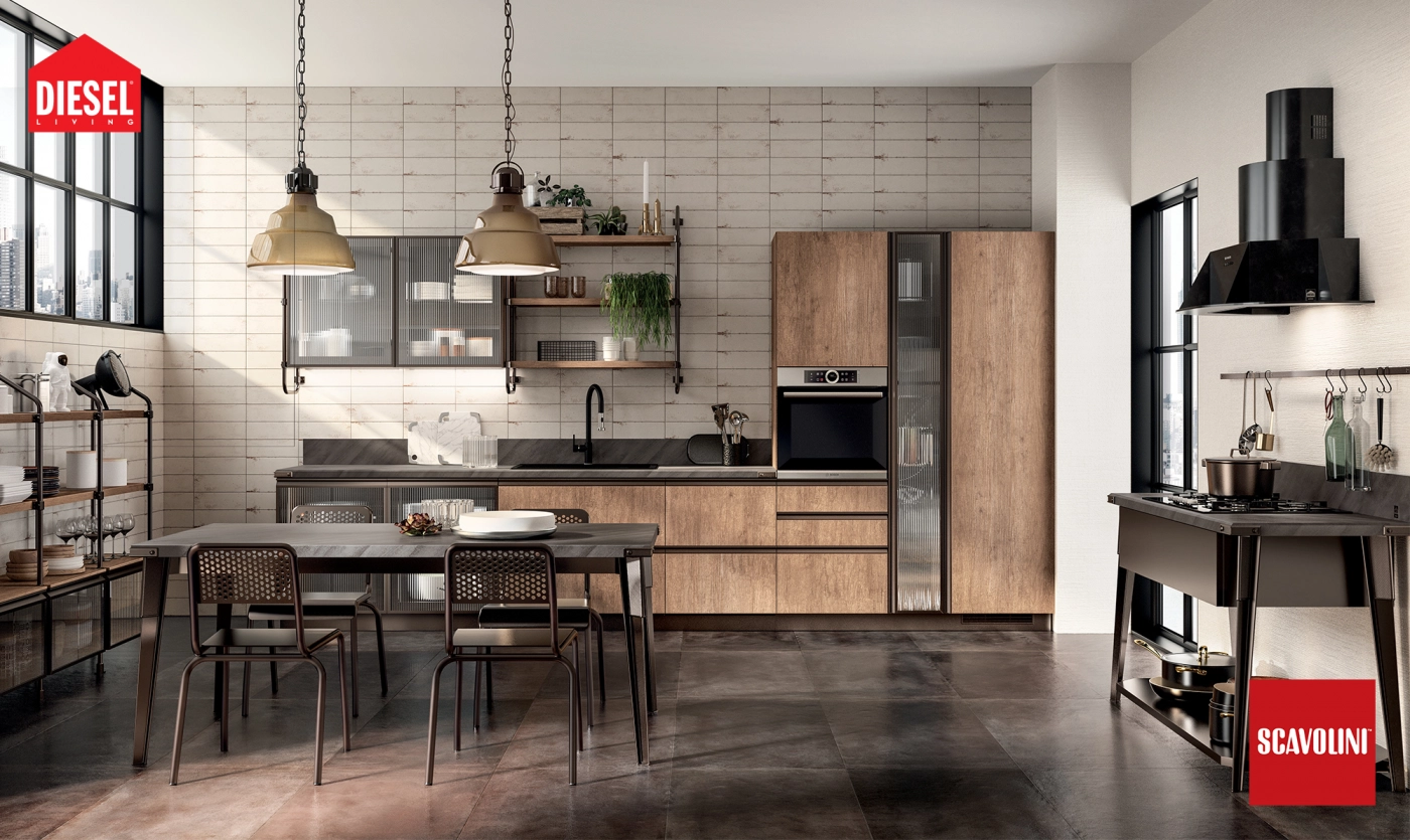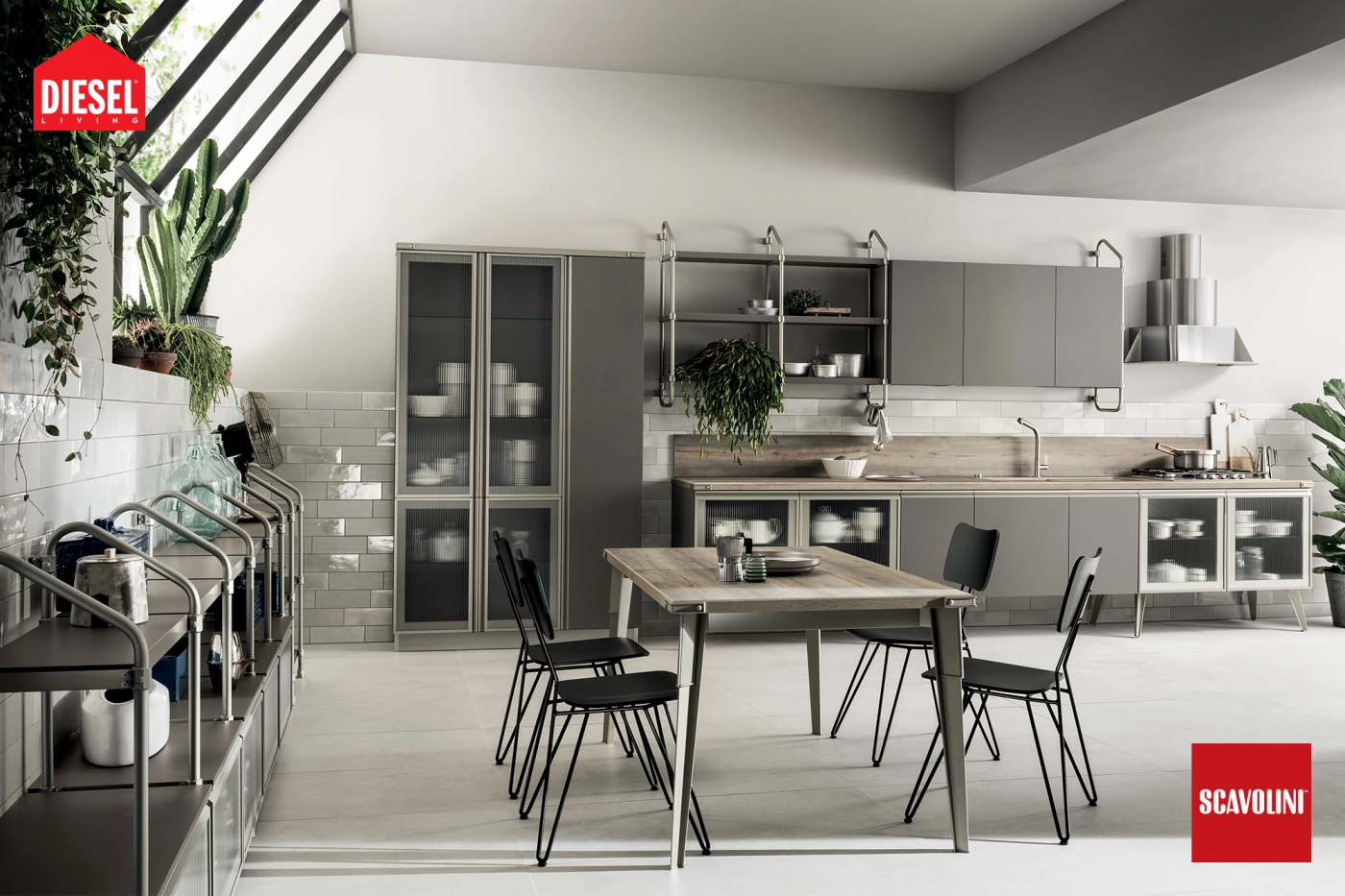 Industrial design finds a new balance. The result of a partnership between the Diesel Living team and Scavolini, Diesel Open Workshop is a new chapter following on from the astounding success of the Diesel Social Kitchen, "a new idea" that is set to be just as successful, if not outright more effective in evocative terms.Diesel Open Workshop: the kitchen restyled with an industrial twist.