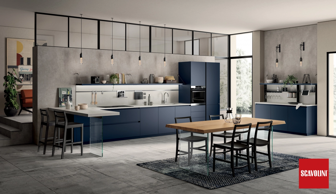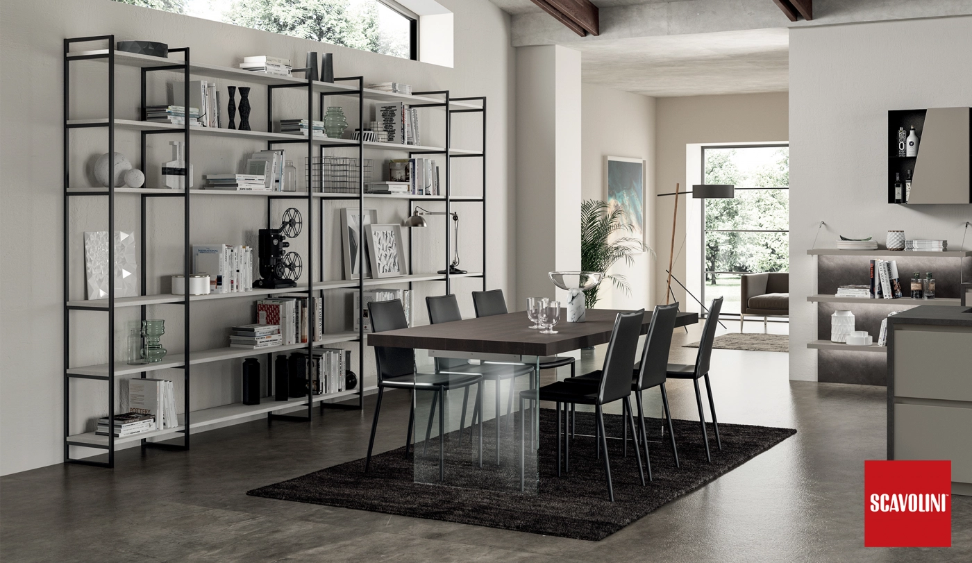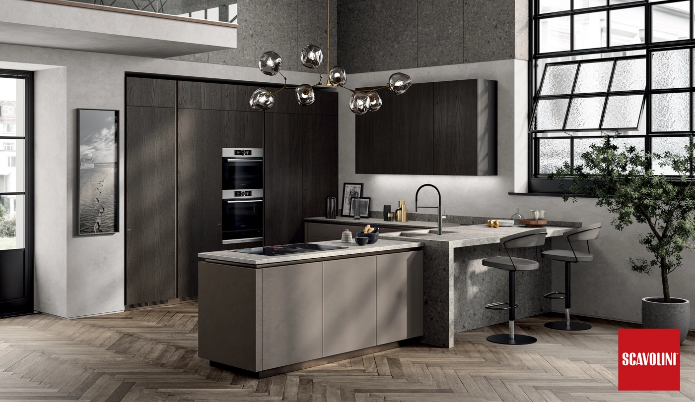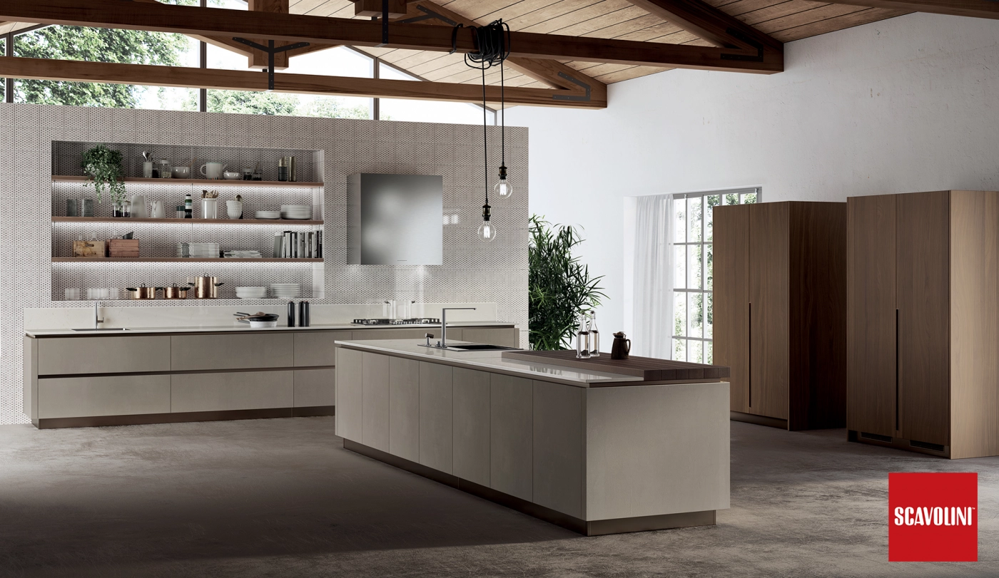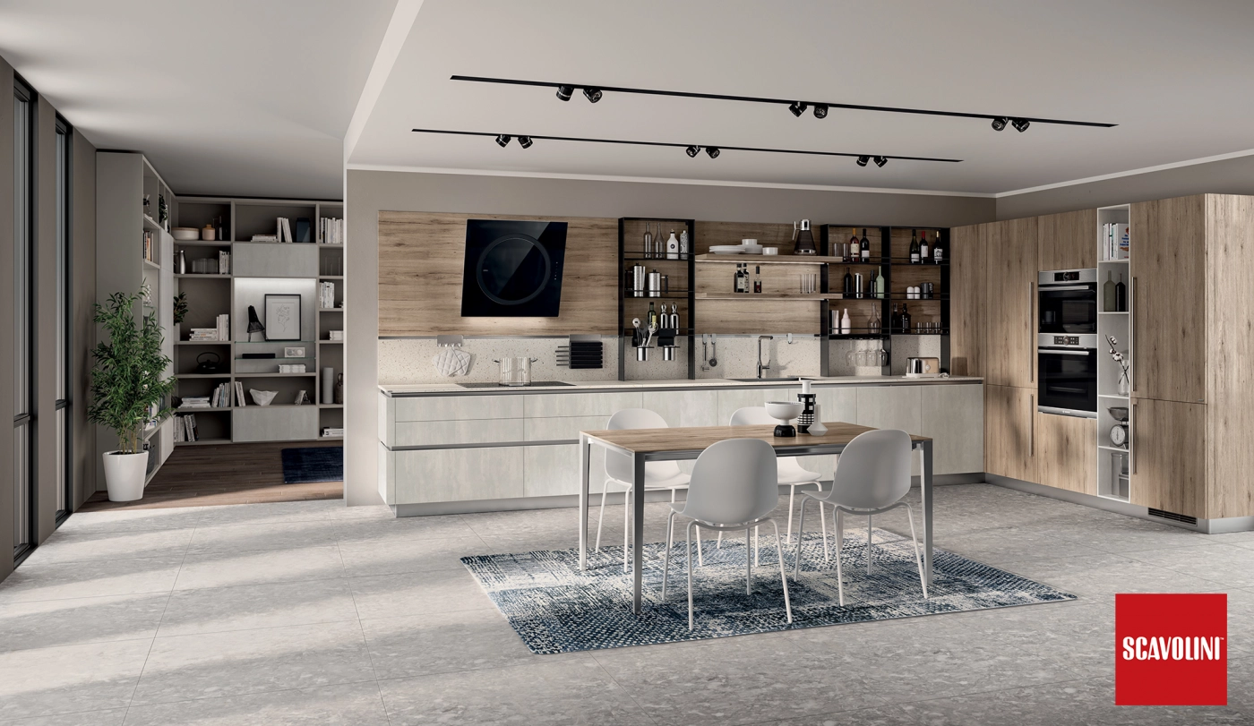 Characteristic features: an attractive design and minimal styling (thanks to the absence of handles), open-fronted modules for the most diverse confgurations, appealing living room elements and a great variety of finishes and colours. Indeed, the focus lies on materials: Marble effect laminates, available for doors and tops; warm Walnut effect decorative melamines and Oak decorative melamines, all with vertical grain; textured effect Biomalta with a metropolitan feel; attractive metal effect lacquers.These are all stylish choices for a truly classy kitchen.