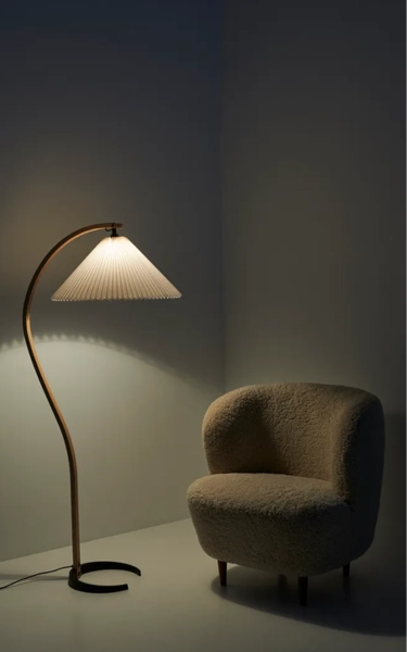 Timberline floor lamp is a classic Scandinavian design from the 1970s. It quickly became an international sensation due to the playful expression, the meandering organic form and the natural materials. This is precisely what makes it aesthetically unique among its peers. The carefully thought out design, such as the inlaid cord and the adjustable directional screen, shows Mads Caprani's attention to quality and detail. The name derives from the Danish designer's fascination with the shapes and lines of the trees that unite in oak and birch against the solid and contrasting iron foot in an organic form.