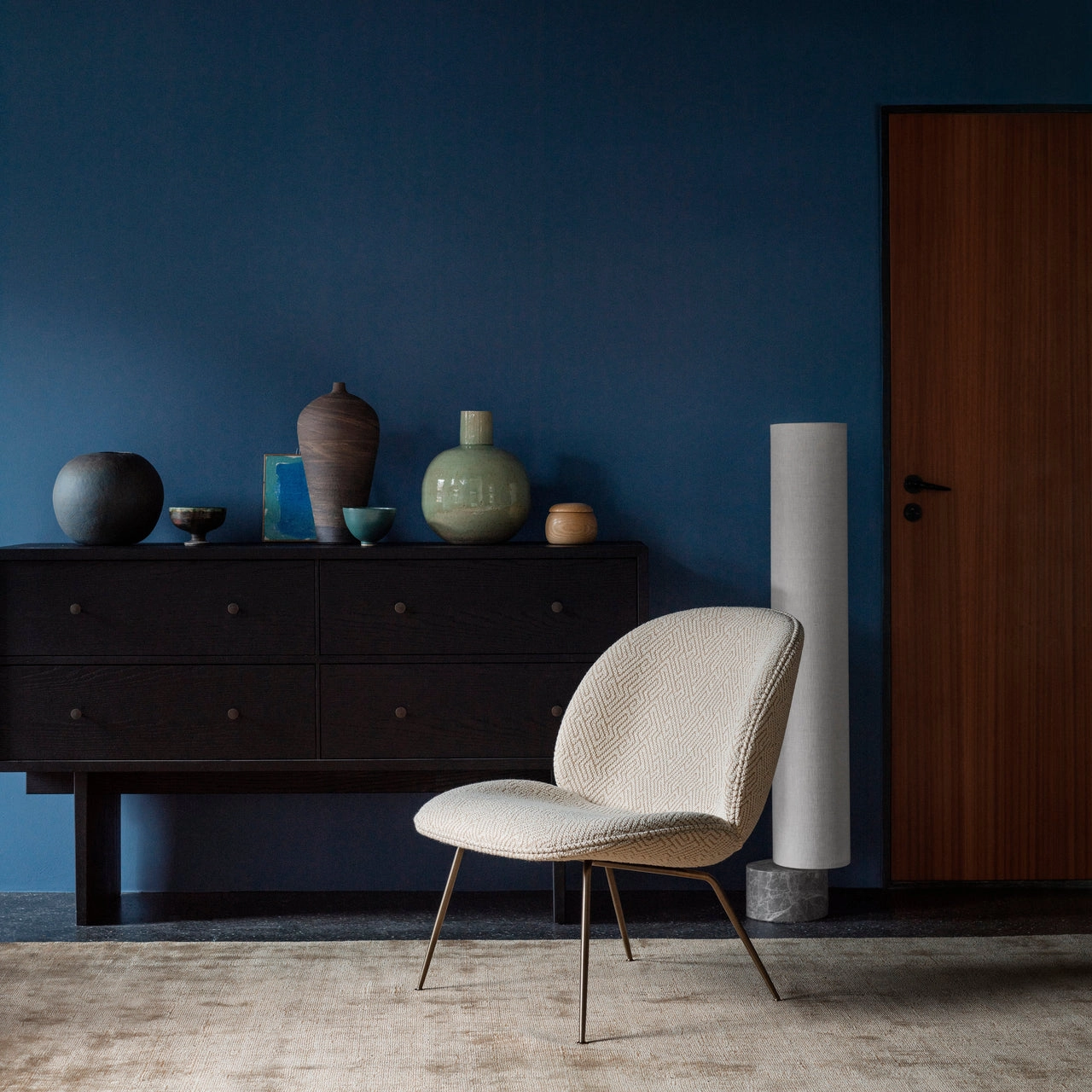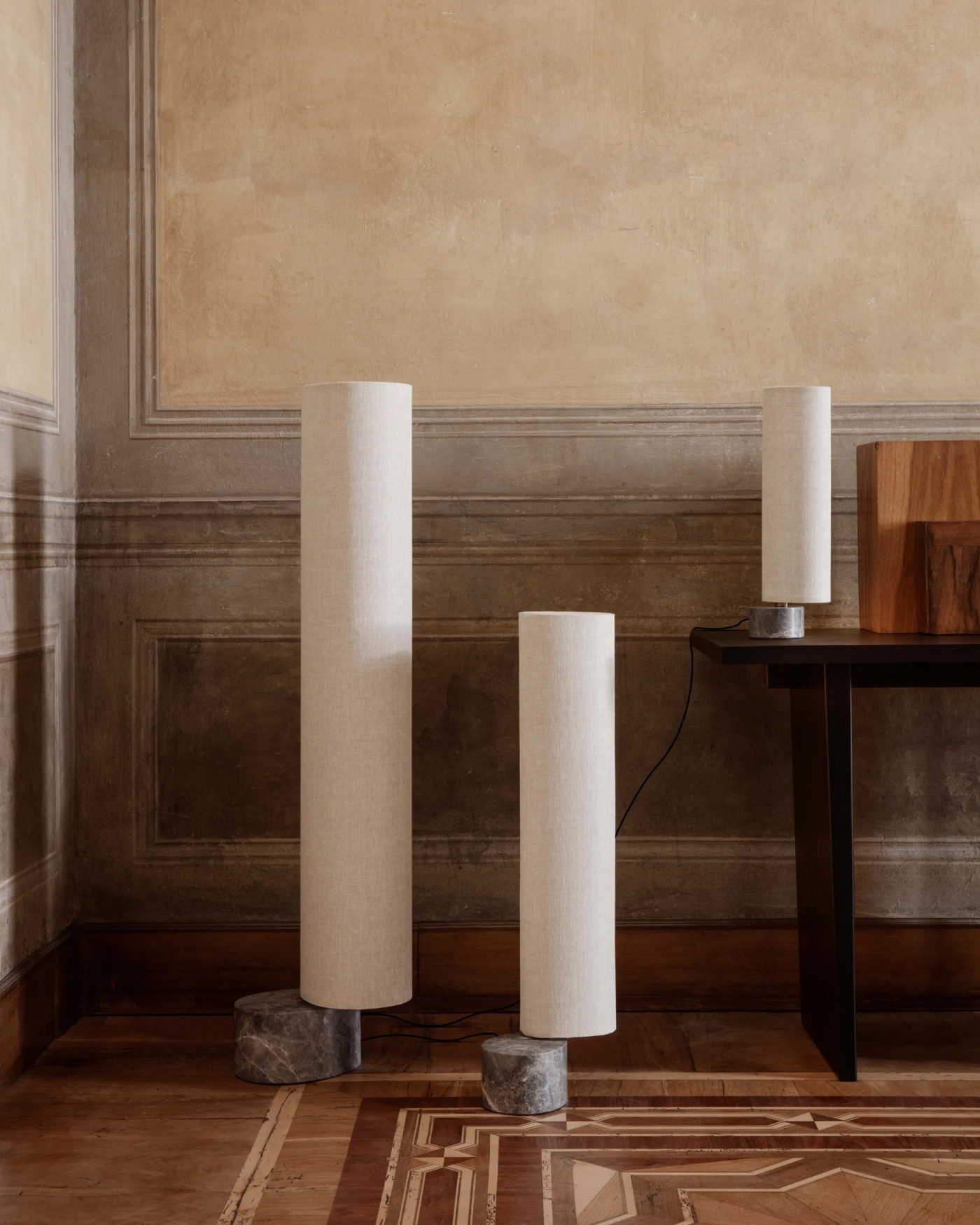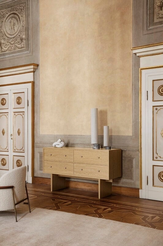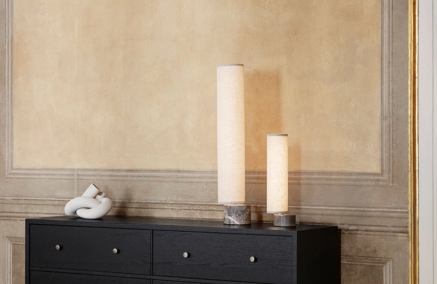 GUBI's Unbound floor lamp brings a sophisticated yet cosy atmosphere to a wide range of interior styles. Designed by the studio Space Copenhagen, the Unbound lighting series is inspired by the aesthetics of Japanese paper lanterns, which can be seen in the ethereal, canvas shade. A teardrop-shaped, solid marble base acts as a heavy anchor to support the lightweight, slender shade.