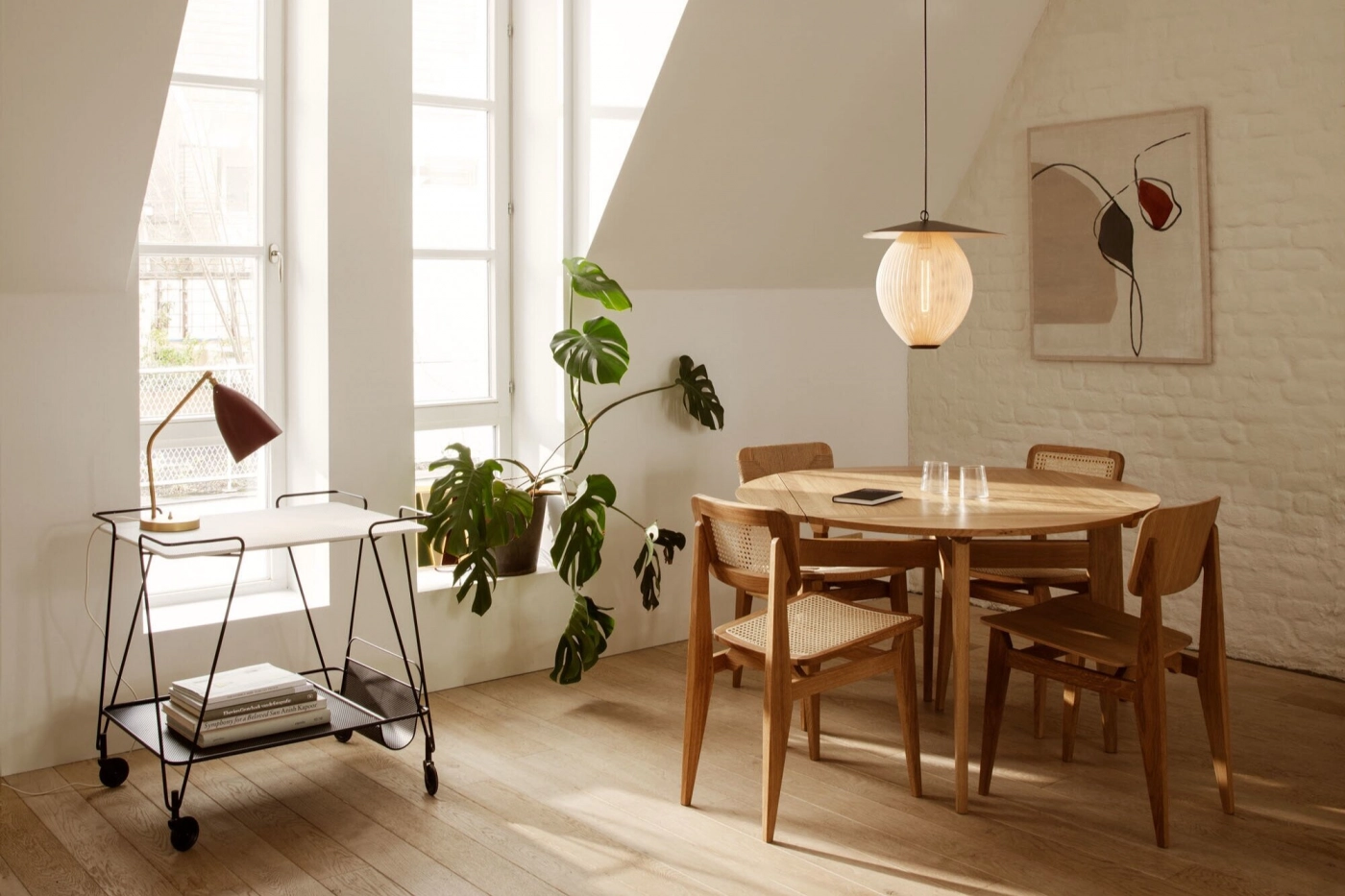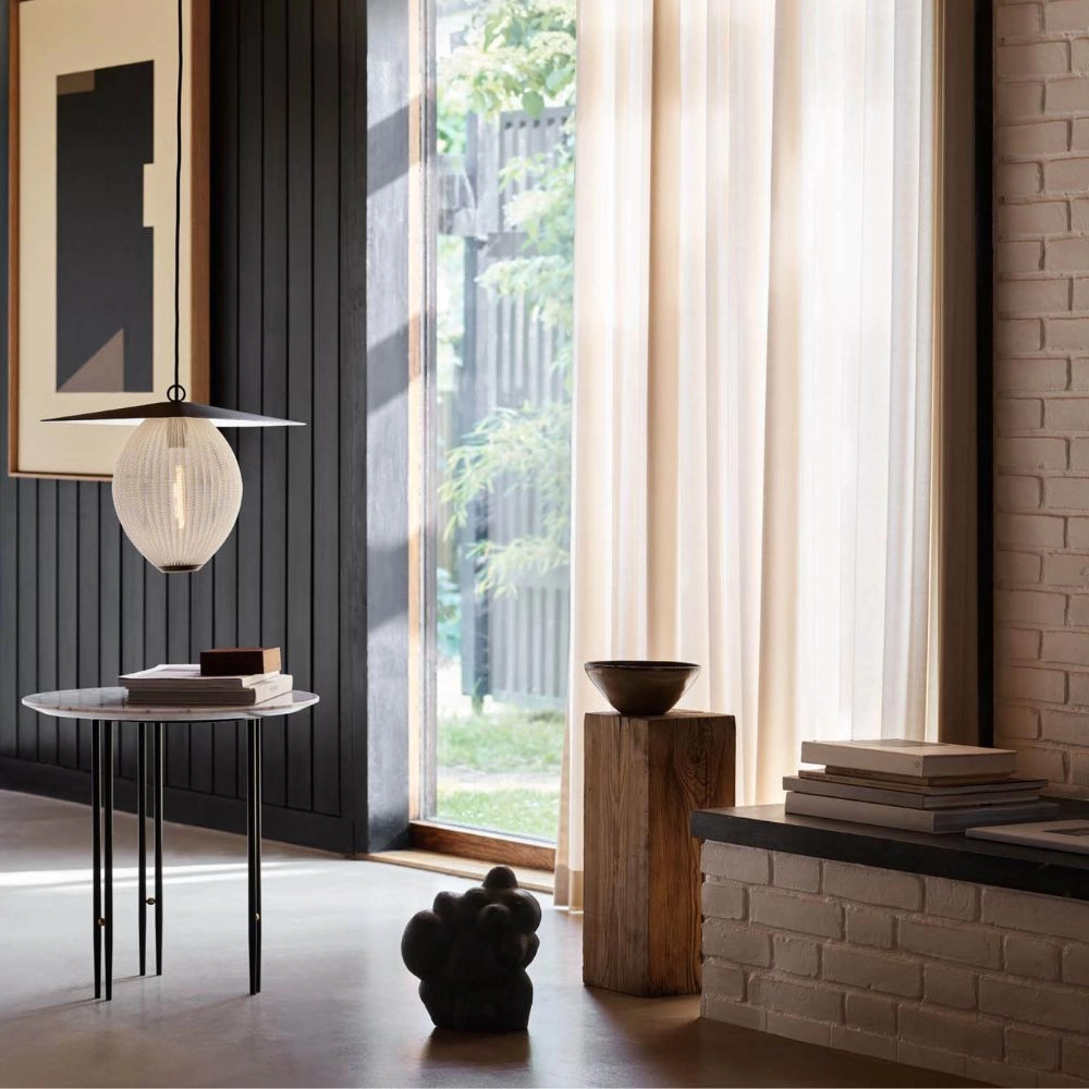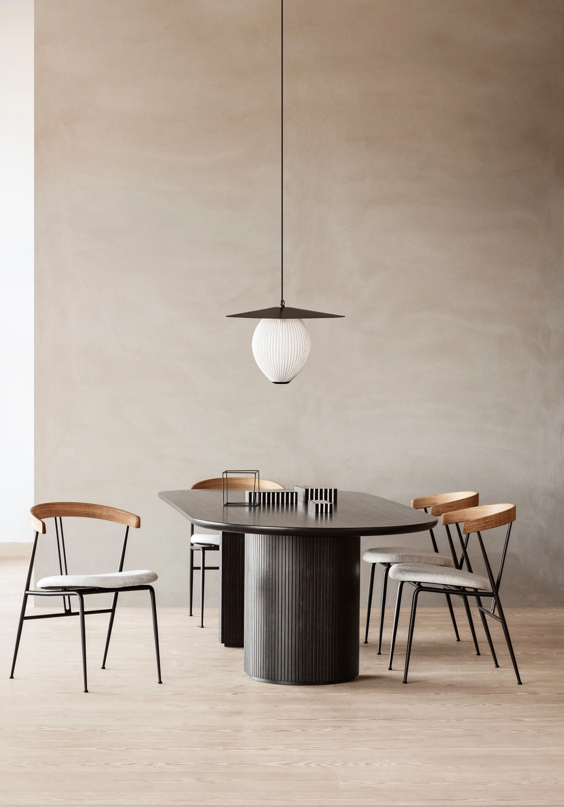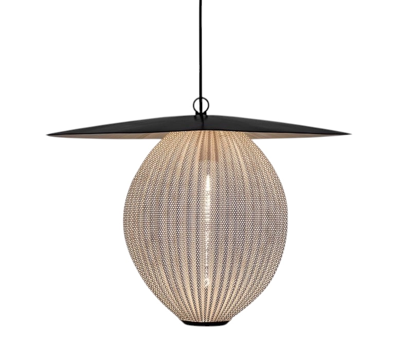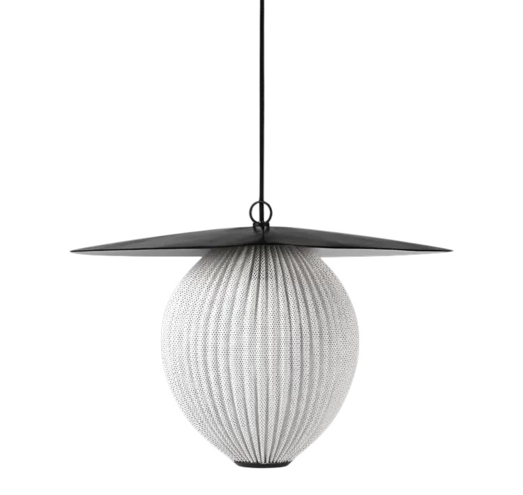 The Satellite Pendant of two sizes is designed by Mathieu Matégot in 1953 with geometrical shapes and an organic shade to create outstanding sculptural aesthetics. The name, Satellite, was given by Matégot as a wink and tribute to the scientific progress in France in the years after the Second World War. The Satellite Pendant holds the distinctive trait of Rigitulle, a technique and material invented by the designer himself that makes it possible to bend and fold the fabric-like metal sheet to an original, oblong-shaped pendant lamp. The lampshade has five colour options; midnight black, white cloud, shy cherry, venetian gold and rainy grey, and is unique with its bulb all covered by perforated metal to exude an atmospheric light - creating a festive appearance.