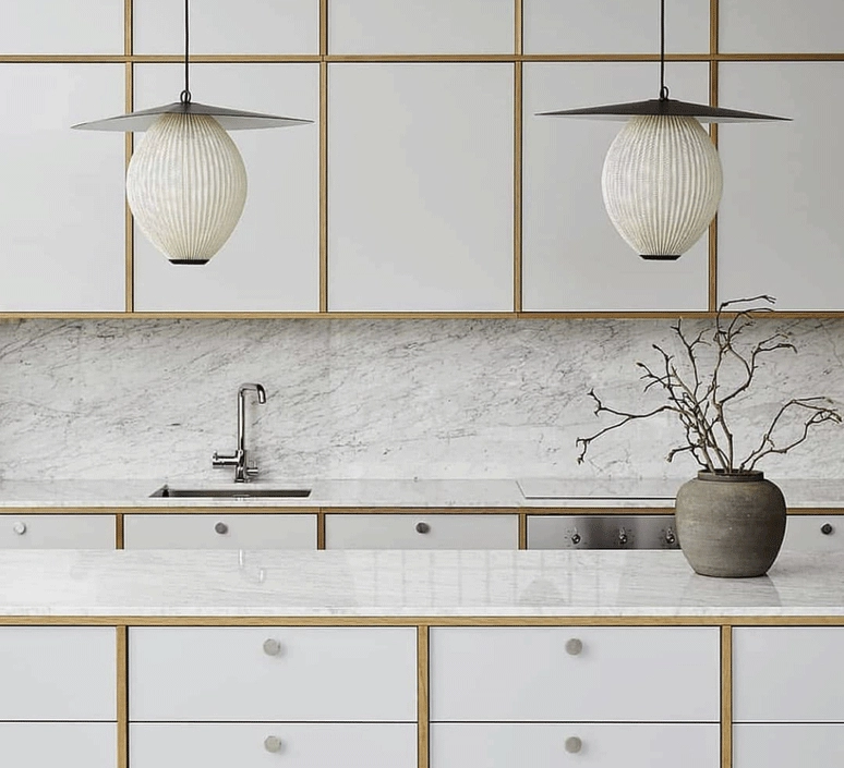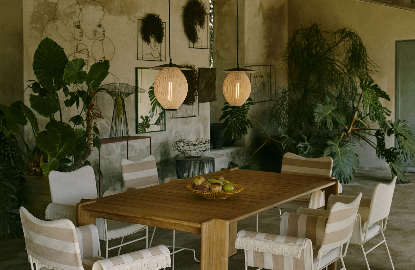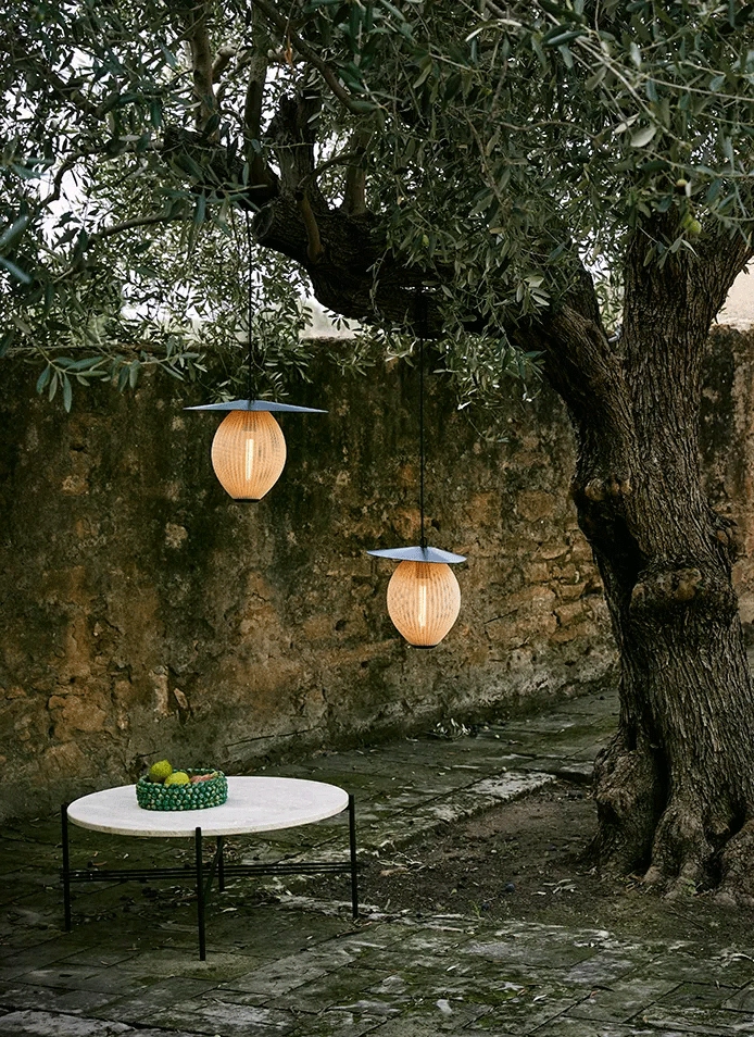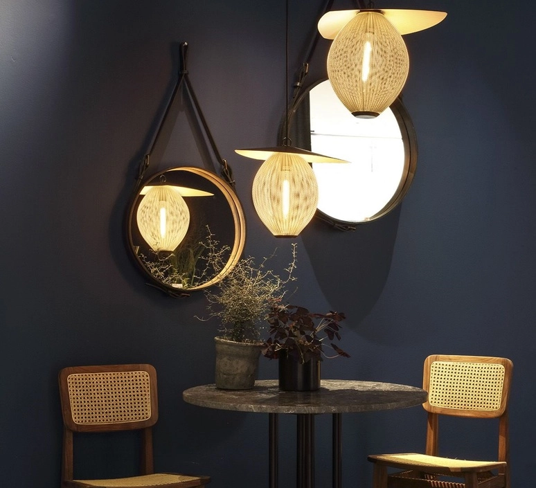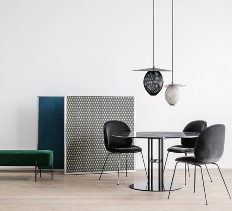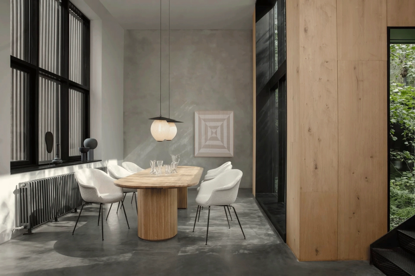 The Satellite Pendant of two sizes is designed by Mathieu Matégot in 1953 with geometrical shapes and an organic shade to create outstanding sculptural aesthetics. The name, Satellite, was given by Matégot as a wink and tribute to the scientific progress in France in the years after the Second World War. The Satellite Pendant holds the distinctive trait of Rigitulle, a technique and material invented by the designer himself that makes it possible to bend and fold the fabric-like metal sheet to an original, oblong-shaped pendant lamp. The lampshade has five colour options; midnight black, white cloud, shy cherry, venetian gold and rainy grey, and is unique with its bulb all covered by perforated metal to exude an atmospheric light - creating a festive appearance.