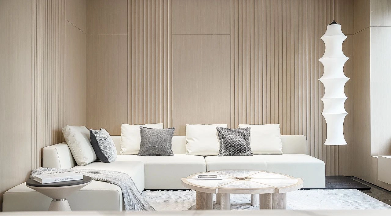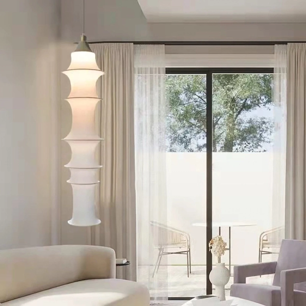 Falkland suspension is a lamp with a spontaneous shape that is achieved by the contrasting forces of its components: the tension of a stretched tube of finely woven fabric and the weight of seven different sized metal rings. A single light bulb and aluminium reflector illuminate the curves of the fabric.