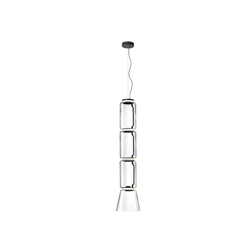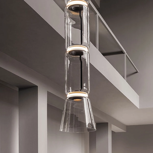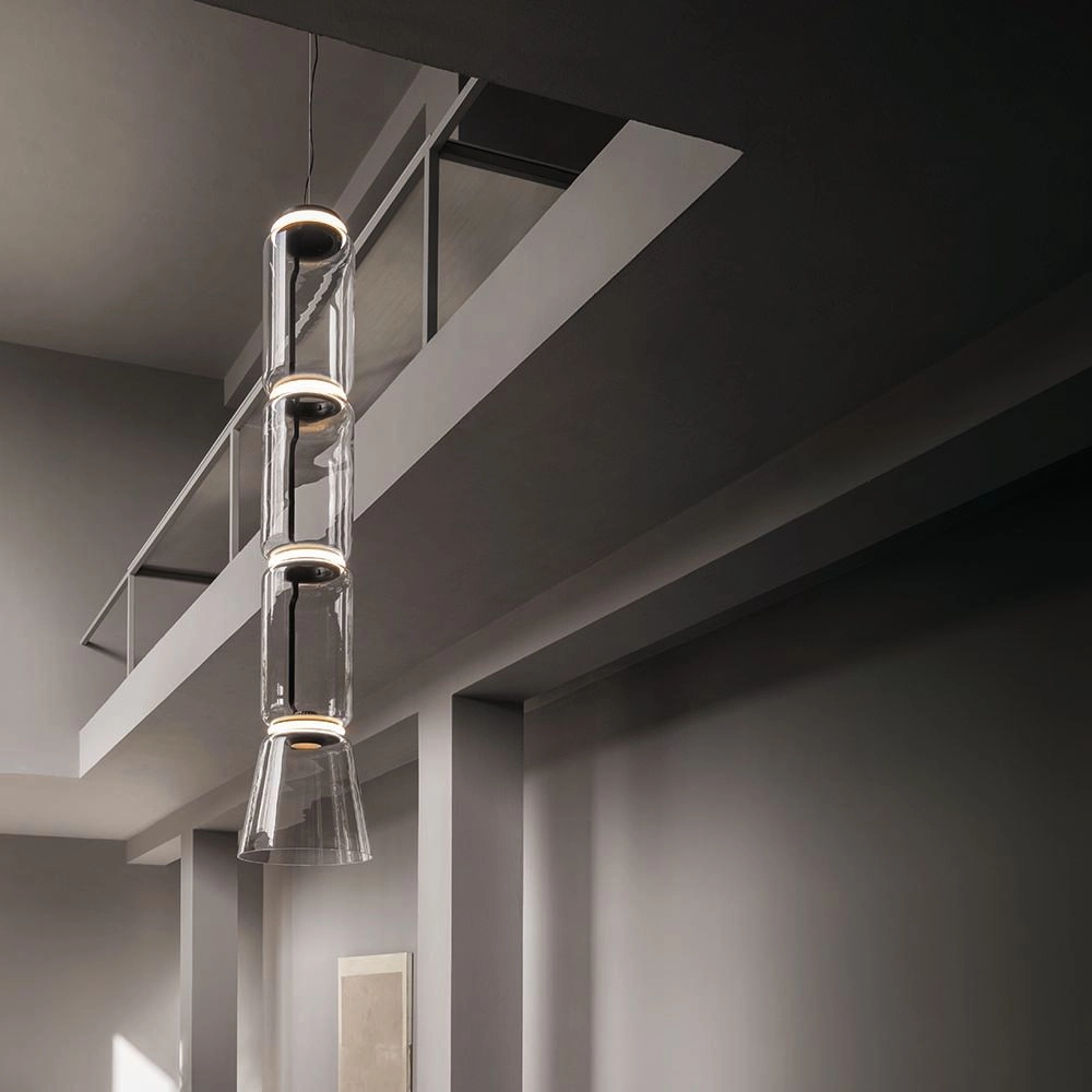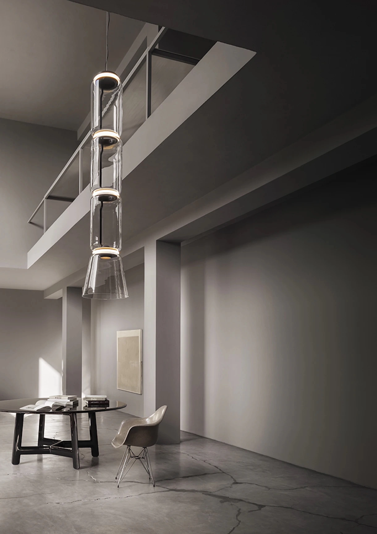 Noctambule: the night owl or reveller. Mostly invisible during the day, but coming to glamorous activity at night-time. The analogy is fitting. The new collection of lamps is made of blown glass modules, which are see-through and therefore almost inexistent at day-time. But, when you switch them on in the dark, they transform into georgeous, illuminated lamps. The cylindrical glass modules set the basic grammar of the collection. The single module is a lantern. Several modules stacked on top of each other create a light column, or suspended chandelier inside a stair well. Extra elements such a glass dome or cone shaped head allow for added performance such as a floorstanding uplighter and pendant. The carefully calibrated LED technology which powers the lamps is discretely integrated into the junctions between the glass modules. Almost absent, but ready to be activated at any (night) time.