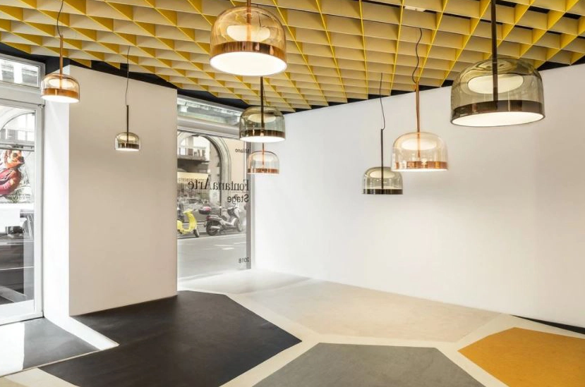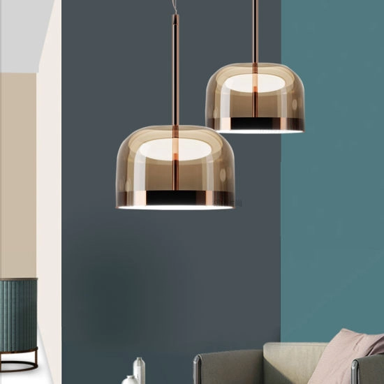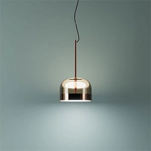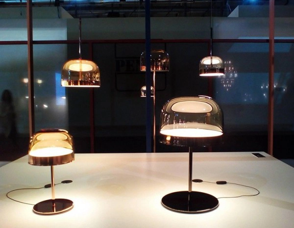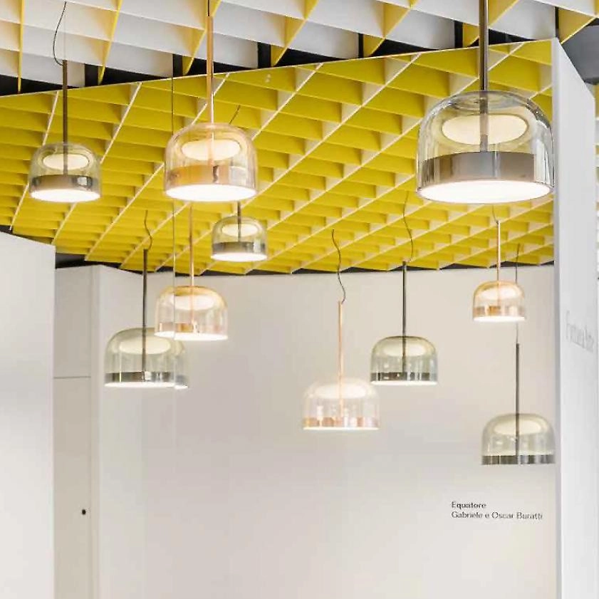 Equatore is a contemporary reinterpretation of the classic lamp with a glass shade. While the traditional abat-jour uses the shade to contain the light source within, in this family of lamps the shade is paradoxically and suggestively empty, with the light being generated by two luminous discs placed inside a central metal band, visible on the shade, that evokes the line of the equator. The light produced by the Leds, thanks to internal screens arranged in layers, is distributed regularly across the surface of the discs, magically illuminating them. The bottom disc directs the light output downward, the upper one illuminates the glass cap for a soft, diffused light. Available in table, floor and ceiling models, in two sizes and two colors: a cooler version in gray with a dark chrome frame, and a warmer version with a transparent dove gray cap and a copper-colored frame.