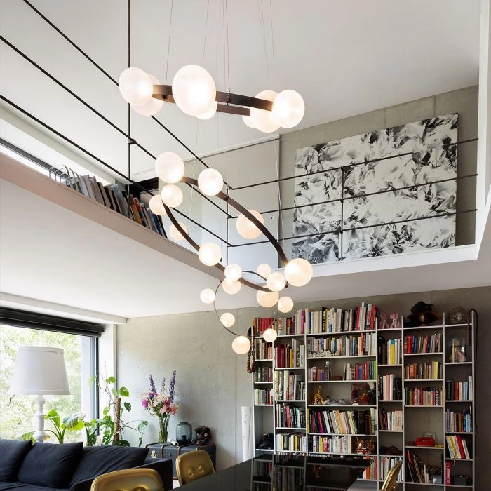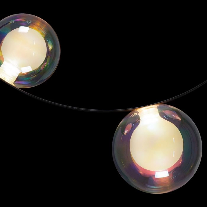 Hubble Bubble, designed by Marcel Wanders studio, is an airy and joyful suspension lamp. Available in two sizes, with either 7 or 11 glass LED bubbles in oil-iridescent or frosted versions. Hubble Bubble can be hung both horizontally and vertically and is powered through Electrosandwich® by Marcel Wanders. Hubble Bubble is the cheery statement piece in your home that can hang from any angle.