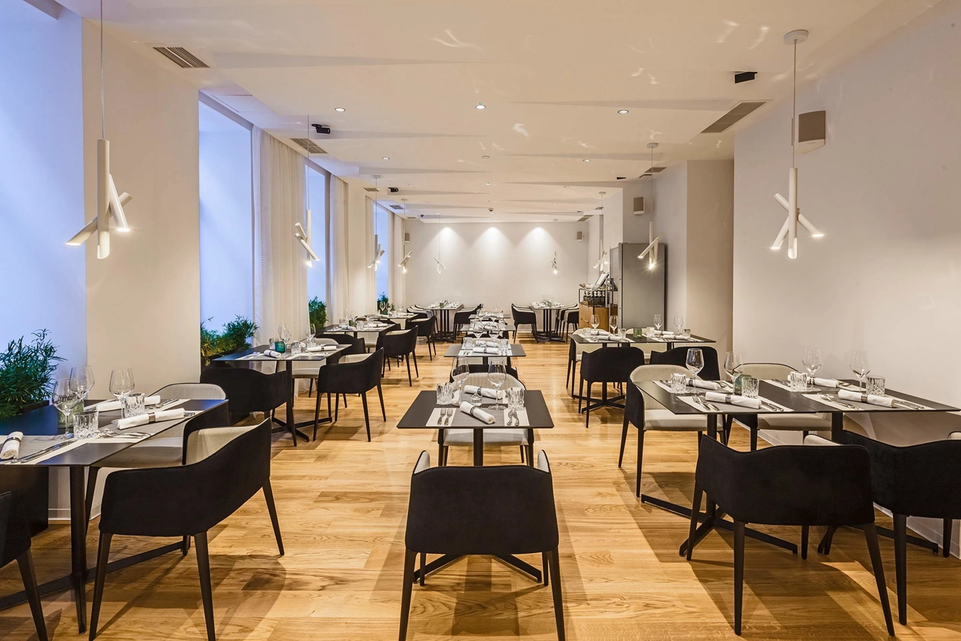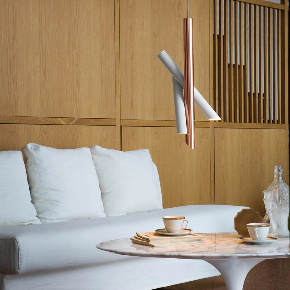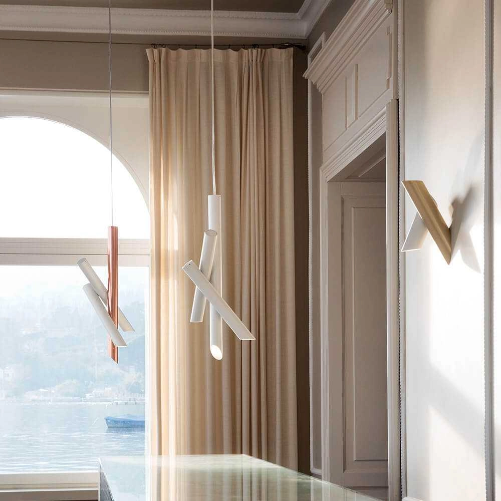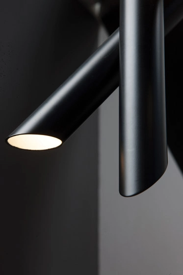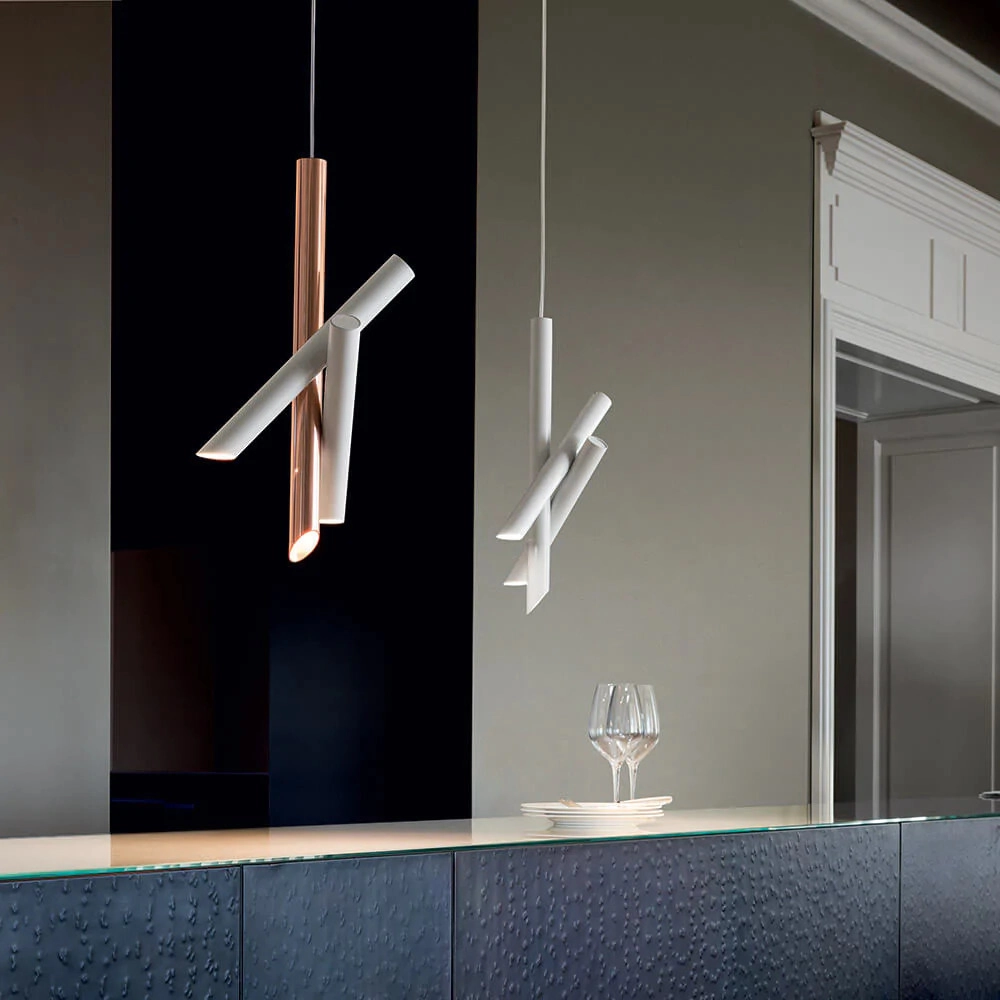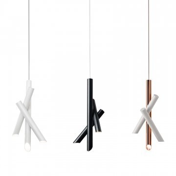 Family of suspension, wall and ceiling lamps, made with tubular elements for objects with a strong and essential design that is expressed through pure forms.