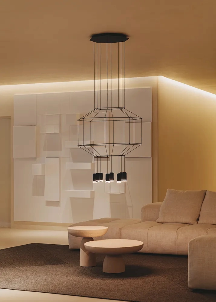 The Wireflow Volumetric collection was designed by Arik Levy. The supporting structure for the Wireflow 3D is constructed by using black electrical cable and a 3.7 Watt LED light source; the lamp is characterized by these very materials which define the collection.