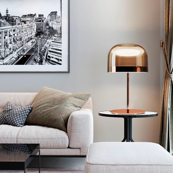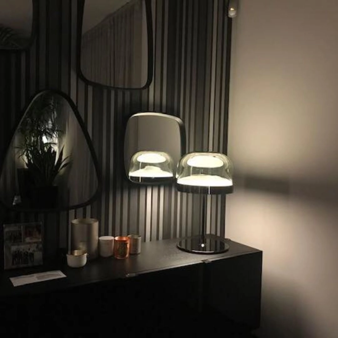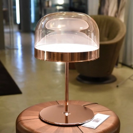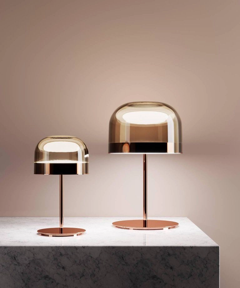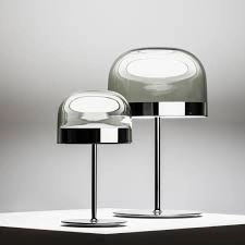 Equatore is a contemporary reinterpretation of the classic lamp with a glass shade. While the traditional abat-jour uses the shade to contain the light source within, in this family of lamps the shade is paradoxically and suggestively empty, with the light being generated by two luminous discs placed inside a central metal band, visible on the shade, that evokes the line of the equator. The light produced by the Leds, thanks to internal screens arranged in layers, is distributed regularly across the surface of the discs, magically illuminating them. The bottom disc directs the light output downward, the upper one illuminates the glass cap for a soft, diffused light. Available in table, floor and ceiling models, in two sizes and two colors: a cooler version in gray with a dark chrome frame, and a warmer version with a transparent dove gray cap and a copper-colored frame.