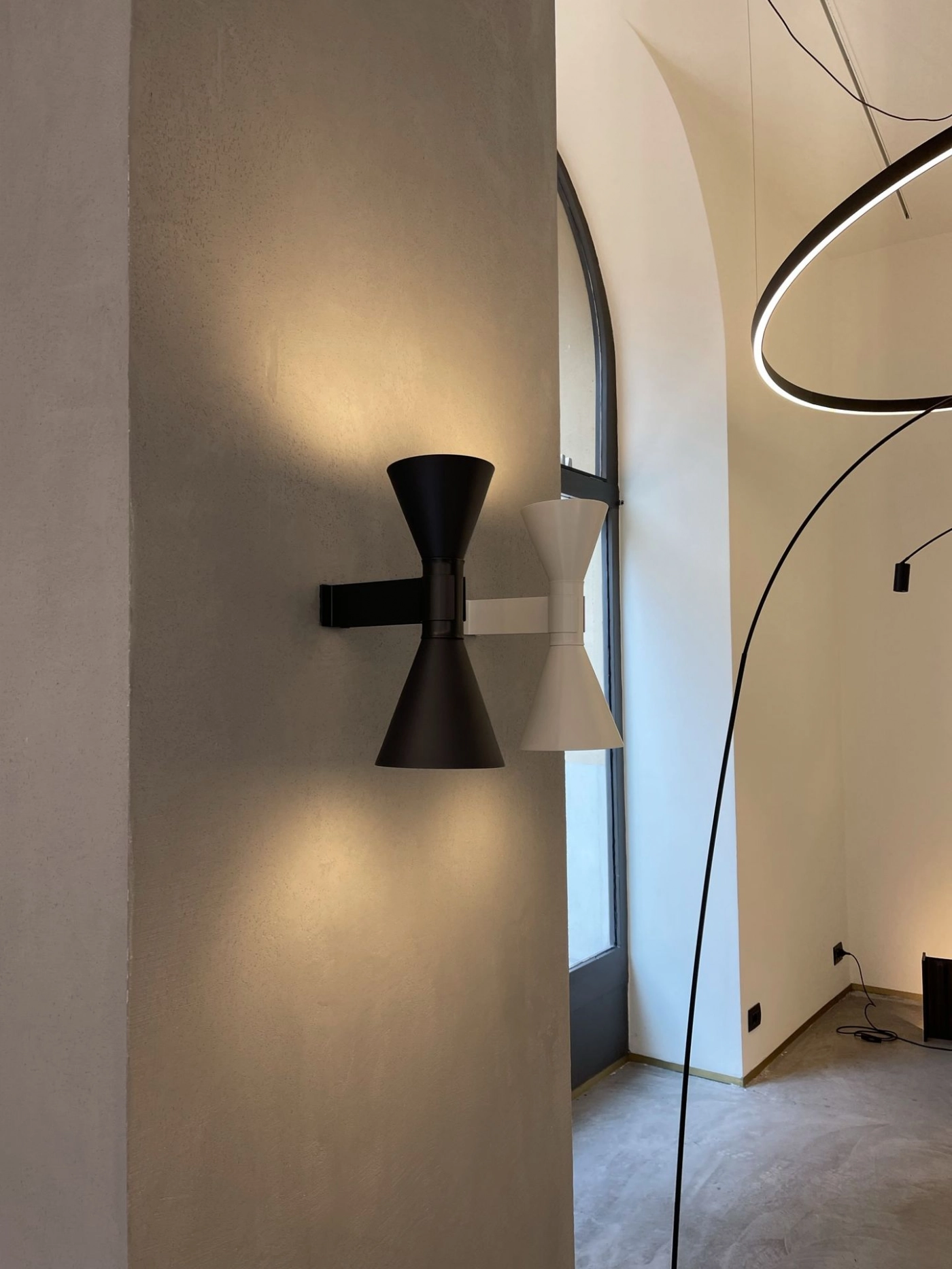 Mini version of the iconic Applique de Marseille Nemo, designed by Le Corbusier for his Parisian flat in Rue Nungesser et Coli. A wall lamp for direct and diffused light: two cone-shaped lampshades direct the light up and down, providing homogenous and sharp light beams. Available in matte grey, whitewash or black finish with an internal white diffuser.