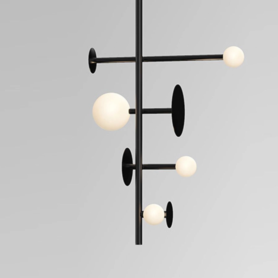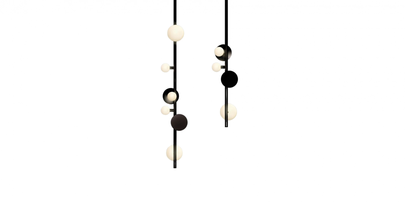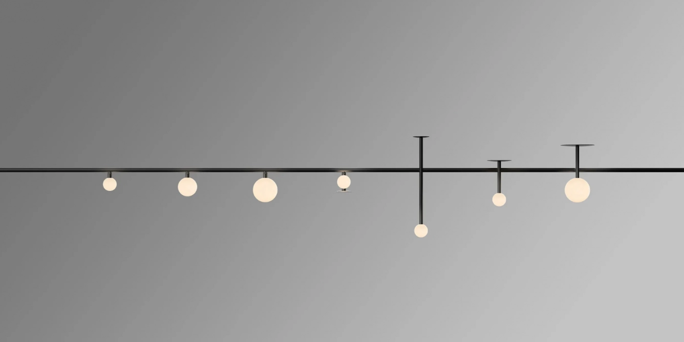 Sculpture suspended in space, the Vela collection tells a story with its planetary spheres and eclipse evoking discs. Named for the Vela constellation, the spherically formed luminaires use the Rakumba Typography rail system as the axis of an orbital space. Distinctive discs can both frame or obscure the decorative arrangement of spheres, creating an interplay of light and shadow.
