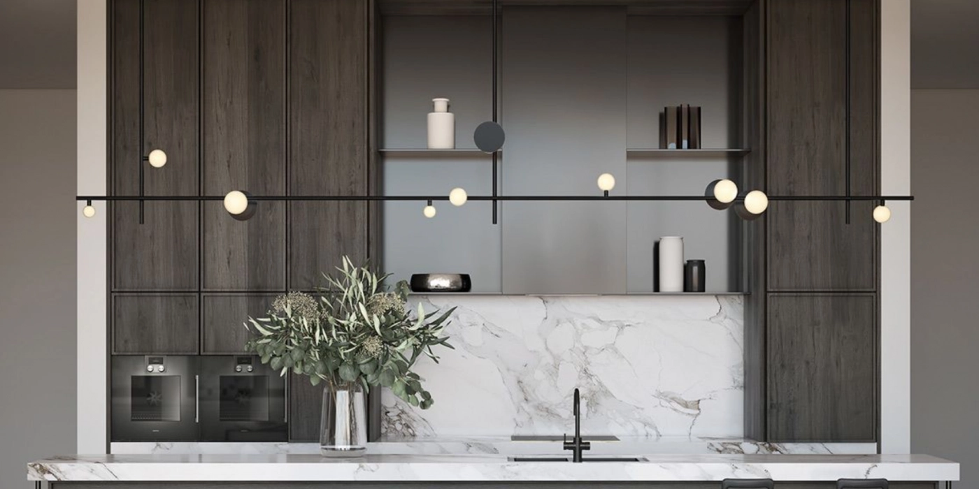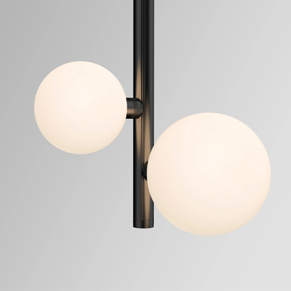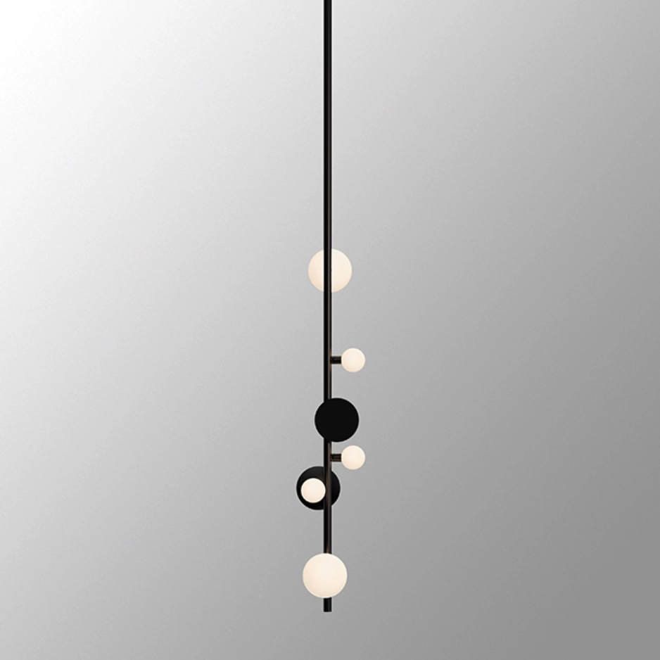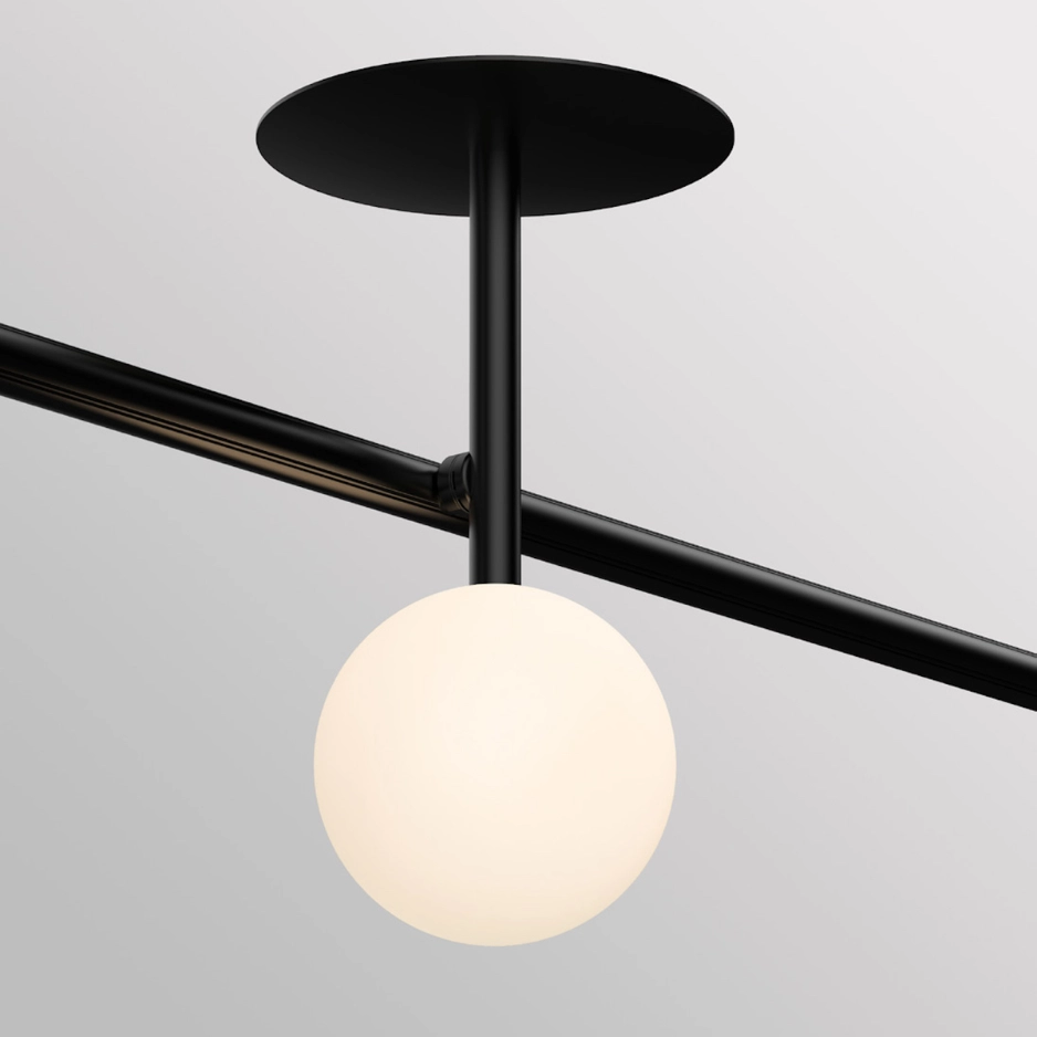 Sculpture suspended in space, the Vela collection tells a story with its planetary spheres and eclipse evoking discs. Named for the Vela constellation, the spherically formed luminaires use the Rakumba Typography rail system as the axis of an orbital space. Distinctive discs can both frame or obscure the decorative arrangement of spheres, creating an interplay of light and shadow.
