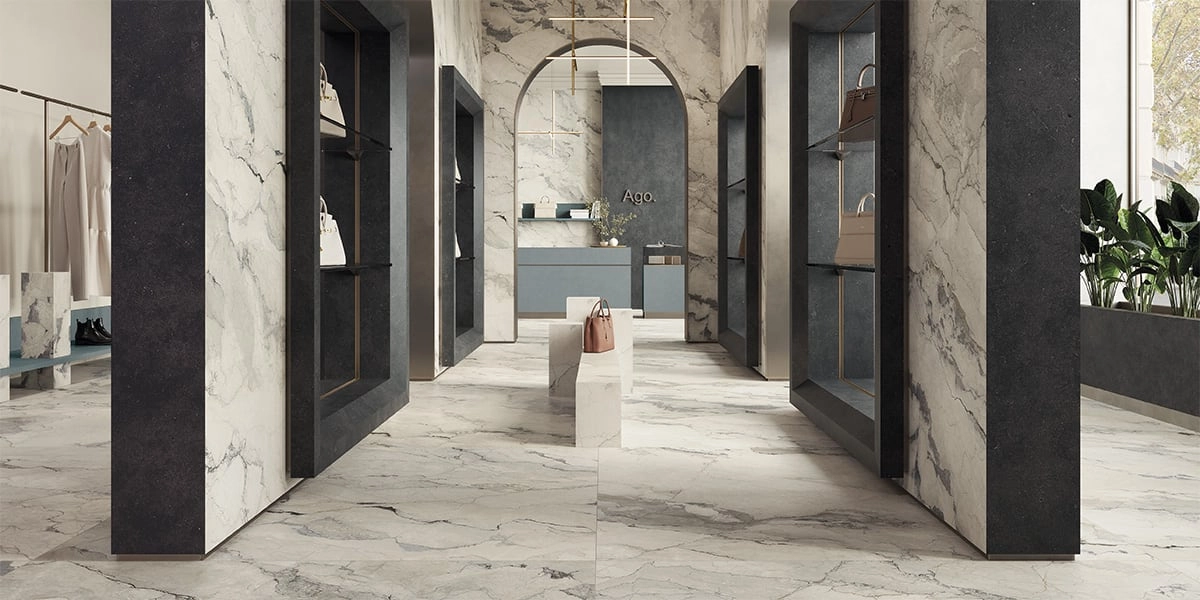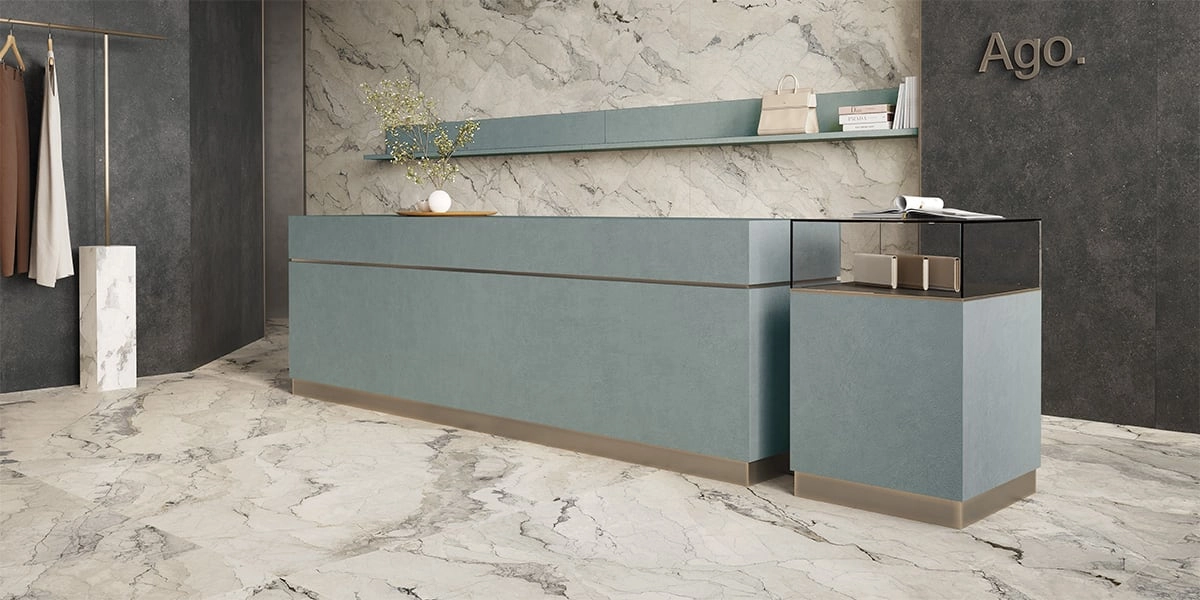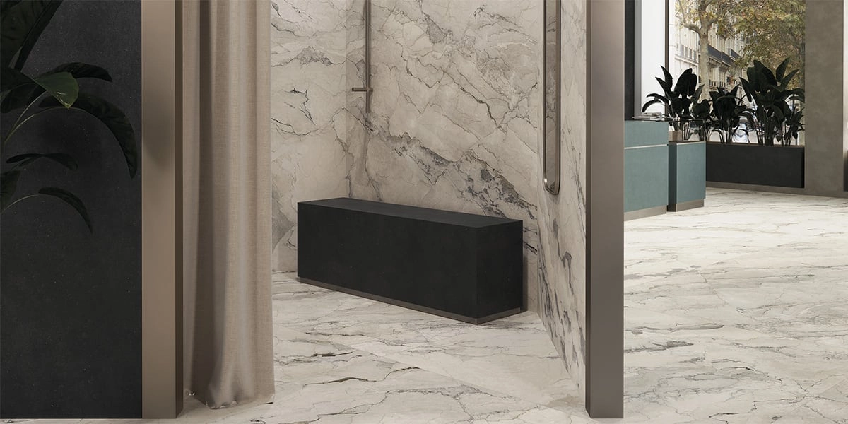 Sophistication, sobriety and pure elegance: Camouflage Maximum emerges from the background, transforming it. Its clear grains that at times fade into shaded areas, add depth to spaces, creating a balance of dark and light, arousing ever-new emotions. Its luminosity is ideal for prestigious projects, floor and wall coverings and external façades, as well as for embellishing furniture. The surface introduces the new feel finish: this smooth matt effect, so pleasing to the touch, offers a timeless beauty, a matt look for a non-reflecting surface with no roughness.