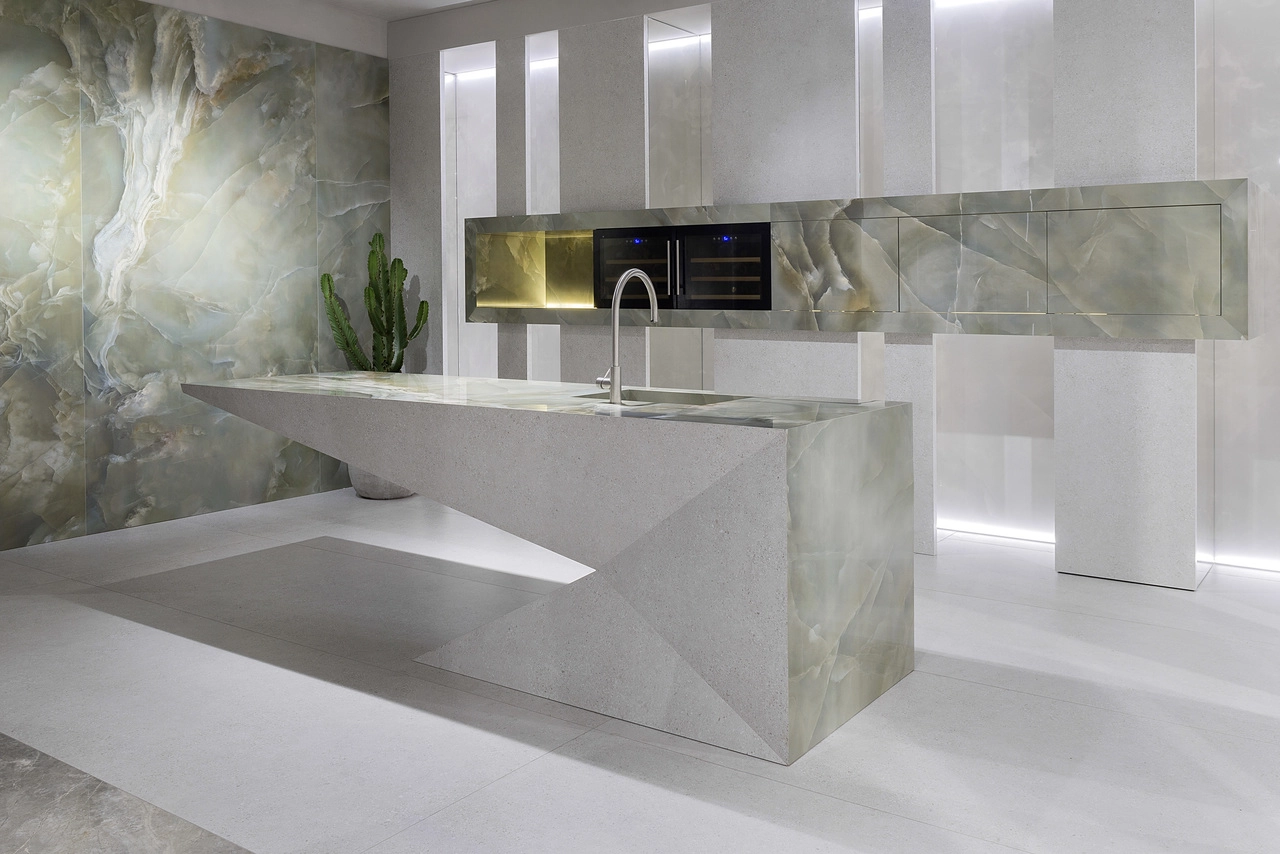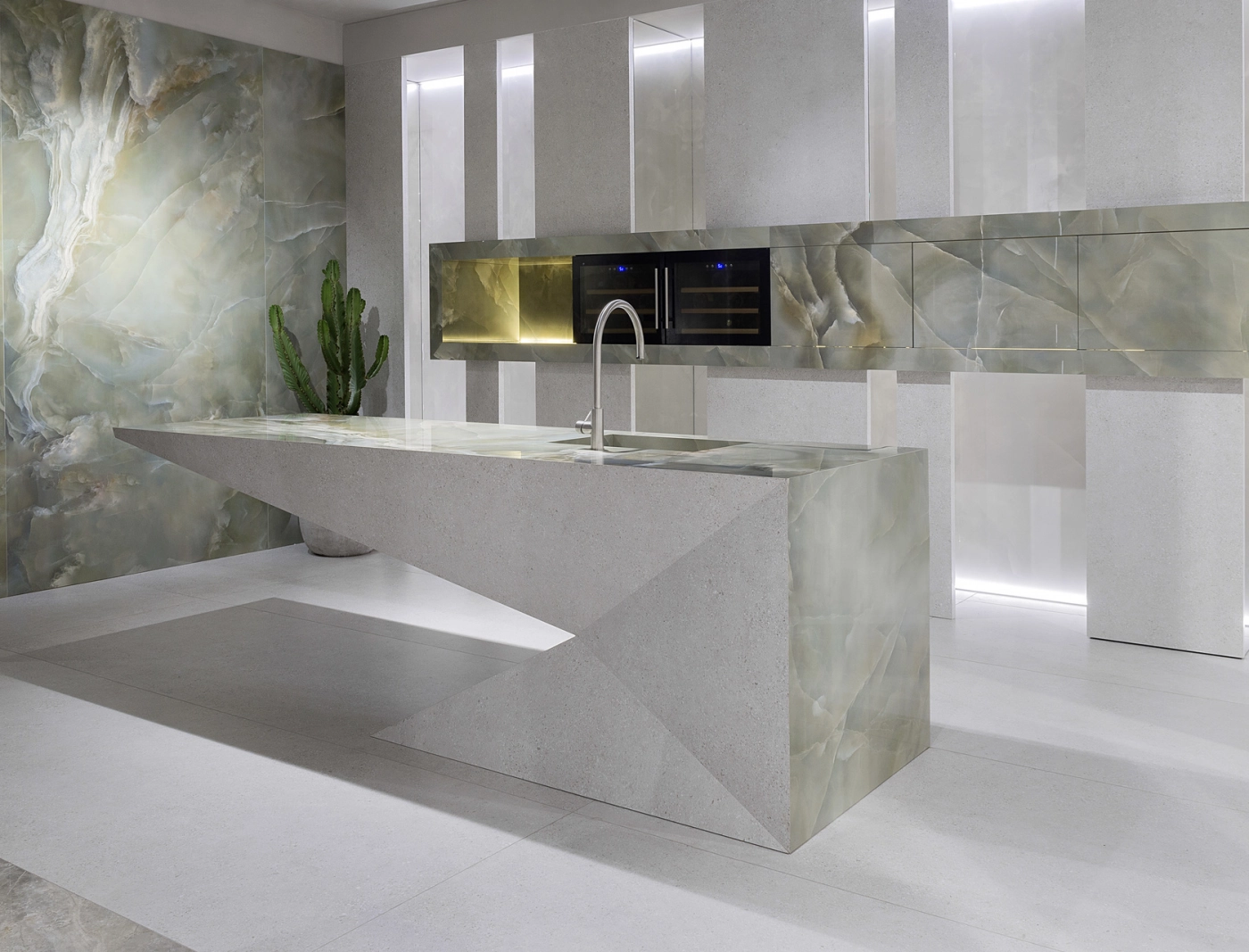 The extremely reduced 6mm thickness, together with the advanced Ultra technology, allows an appropriately powerful band of light to travel through the Onice Ultra slabs and backlight the material.