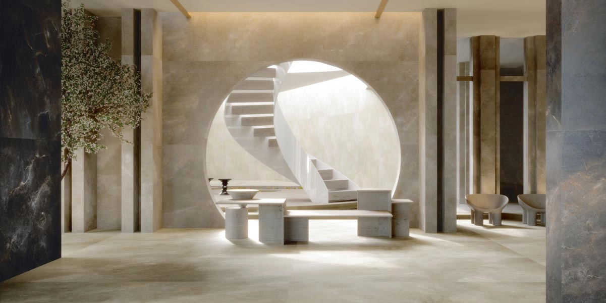 AION is the new Maximum surface that combines simple lines, design rigor and a sense of lightness. The intrinsic beauty of stone is revealed on porcelain stoneware through painstaking and masterly workmanship: a subtle look, with a minimalist character, which goes well with both classic and more elaborate textures.